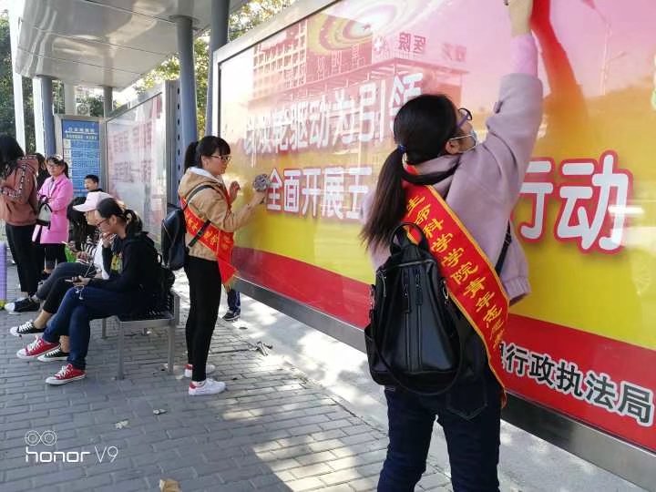 擦亮城市窗口,争做文明市民。生物与食品工程学院学生会青年志愿者协会在2017年11月5日 上午8:40组织了清洗公交车站牌活动。