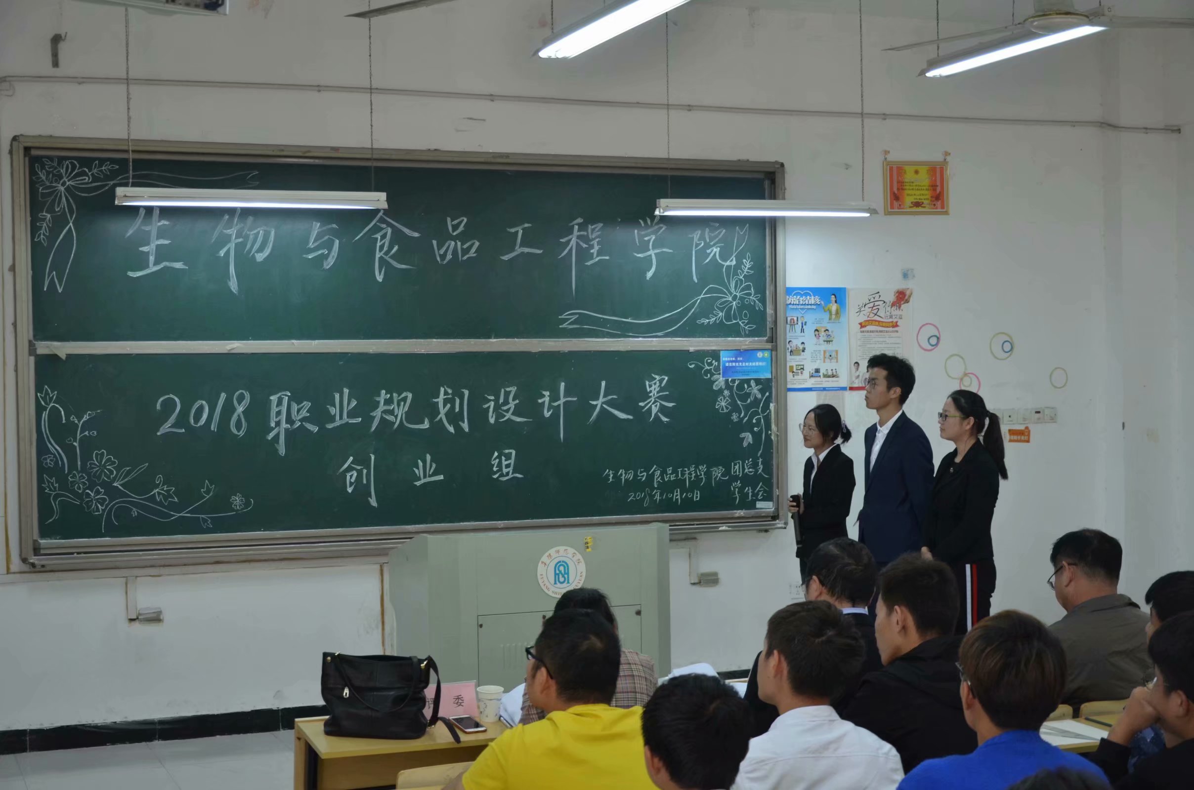 为深入推动大众创业、万众创新,进一步强化大学生职业规划意识和创业意识,生物与食品工程学院于2018年10月10日下午在躬行楼D楼211教室和213教室举办了大学生职业规划大赛暨大学生创业大赛创业组和就业组院级决赛。生物与食品工程学院党总支书记程建,院长崔亚东、教师金继良、刘生杰、张源、范亚丽、李婷婷莅临指导并担任评委。