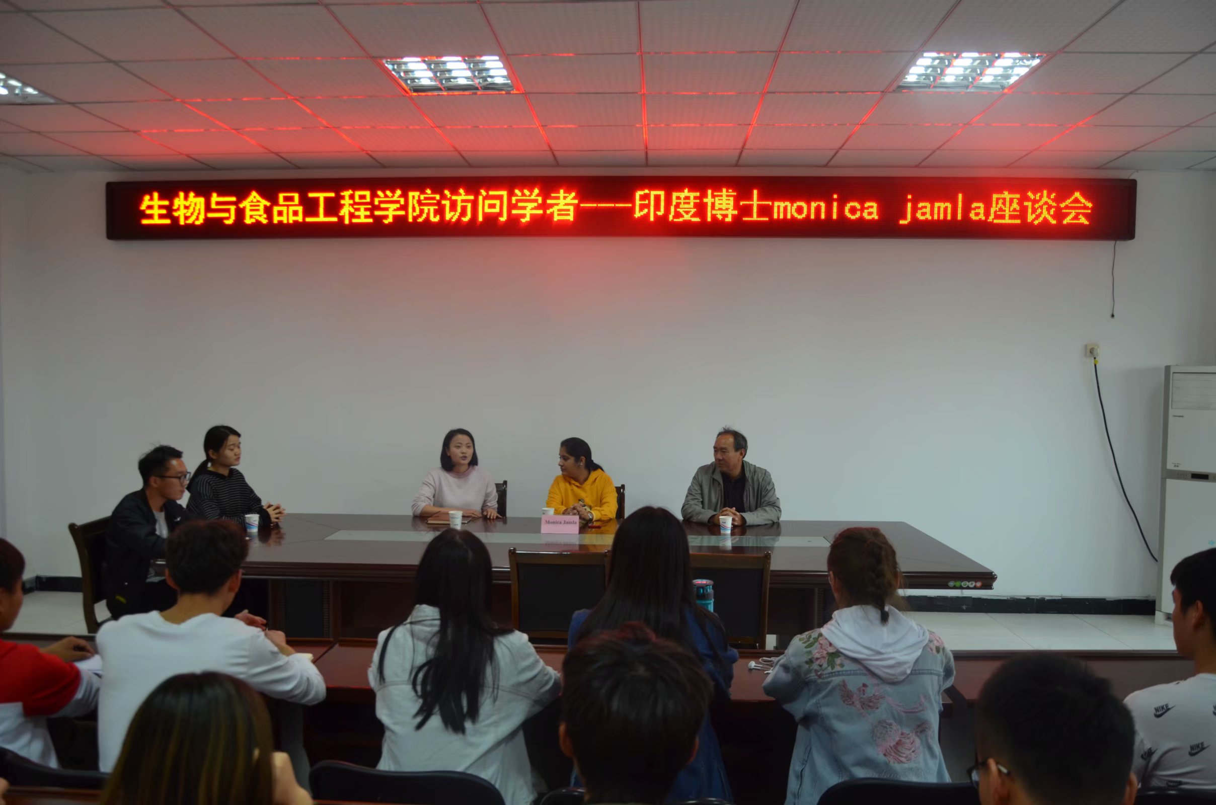 为了促进中印文化交流,生物与食品工程学院于10月23日在躬行E楼302会议室开展了访问学者印度博士monica jamla座谈会,出席本次座谈会的有生物与食品工程学院党总支书记程建、印度博士monica jamla、团总支老师李婷婷、各班级学生代表。座谈会由李婷婷主持。