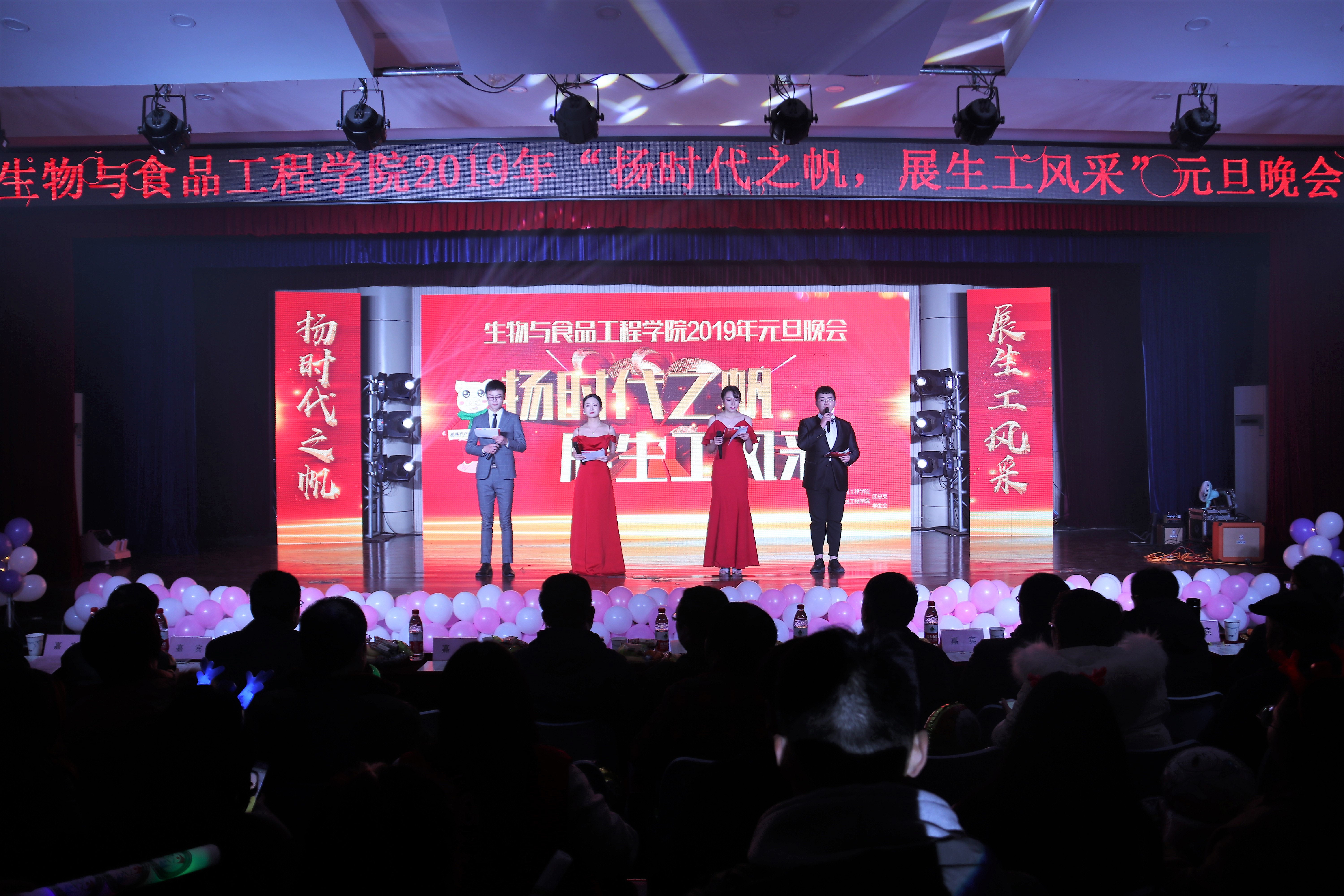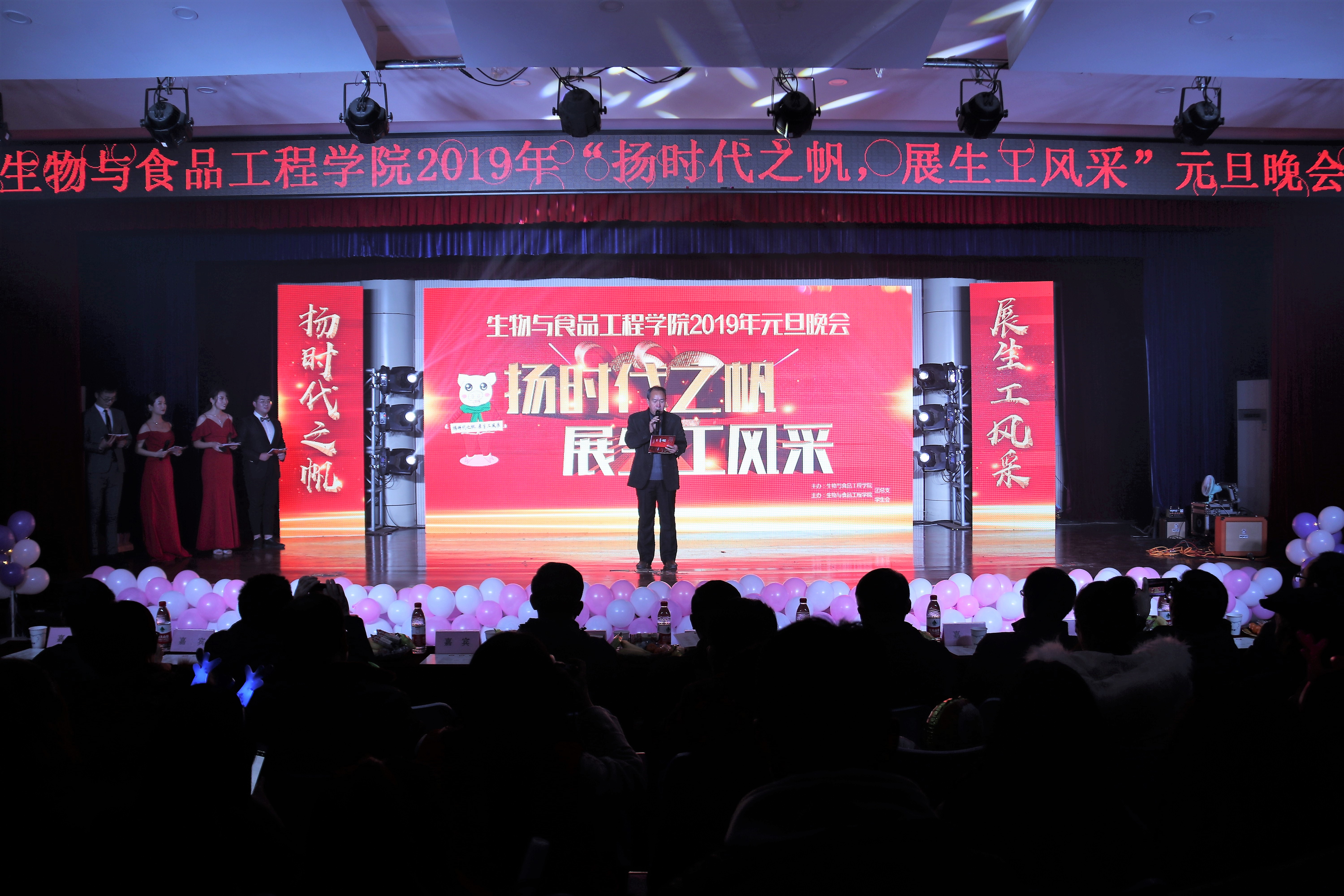 扬时代之帆,展生工风采,12月17日晚18:30生物与食品工程学院在西湖校区小礼堂举办2019年“扬时代之帆,展生工风采”元旦晚会,阜阳市立华畜禽有限公司总经理牛洪波先生、养猪部经理仝德齐先生、行政部经理马华平先生、饲料部经理陈正情先生、校党委宣传部部长张建、校学生处副处长宋东锋、生物与食品工程学院党总支书记程建、院长崔亚东、副院长姜双林、抗衰老中草药安徽省工程技术研究中心副主任屈长青以及其他各位嘉宾与师生共400余人观看了本次晚会。