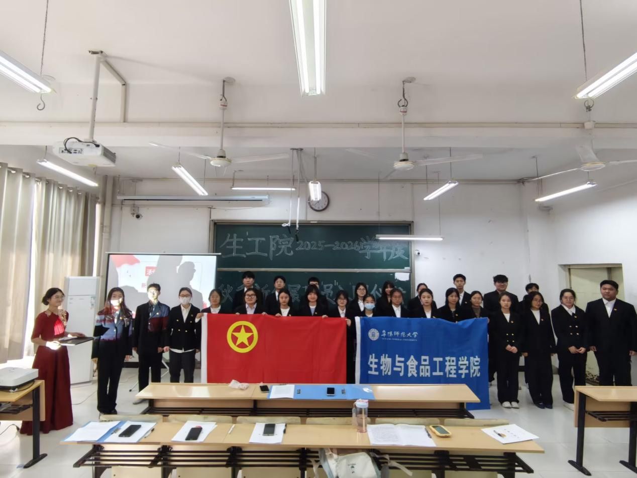为进一步加强共青团组织建设,凝聚青年力量,传承红色基因,生物与食品工程学院于11月24日中午12:30在躬行D楼105教室举行了2025-2026学年度秋季新发展团员入团仪式,全体新团员和团员代表参会。仪式在庄严的《义勇军进行曲》中拉开帷幕,现场氛围庄重肃穆,全体人员起立,共同奏唱国歌。