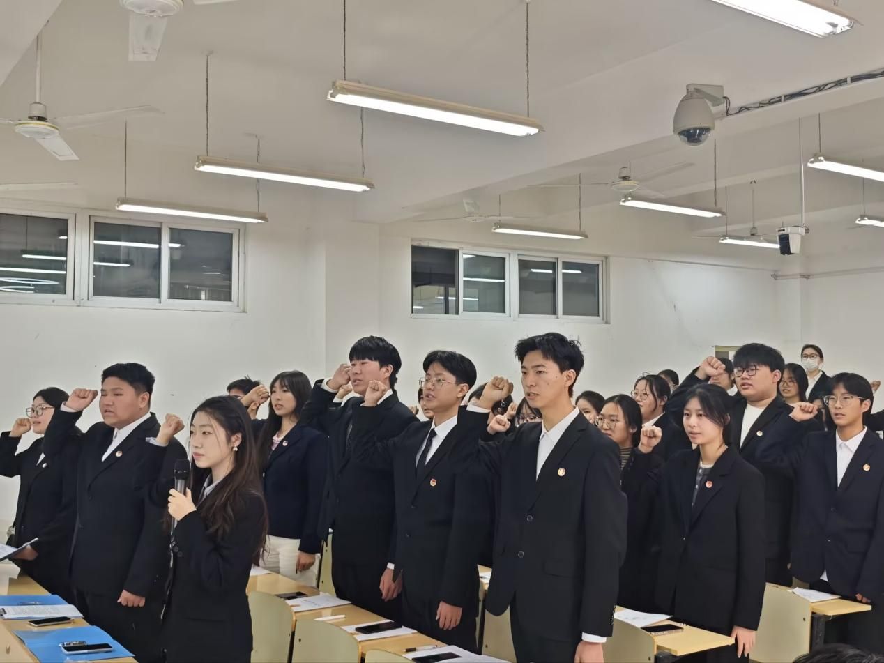 仪式现场,相关人员宣读新发展团员名单,老团员代表为新团员佩戴党徽、发放团员证。熠熠生辉的团徽不仅是身份的象征,更承载着责任与担当。随后,全体新团员面向团旗庄严宣誓,铿锵有力的誓言回荡在教师,展现出青年学子对党忠诚、不负韶华、勇担使命的坚定决心。