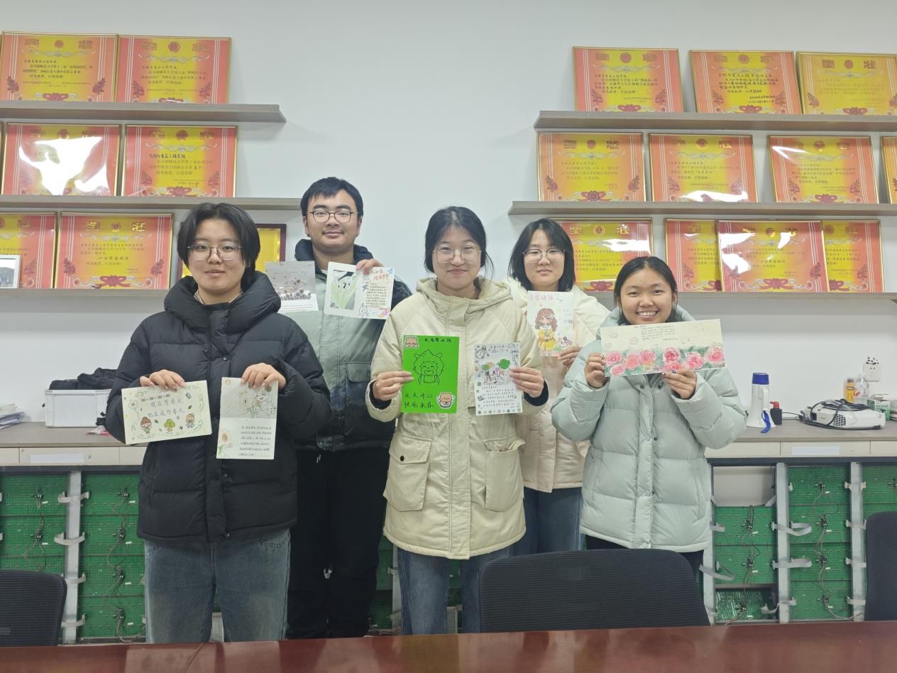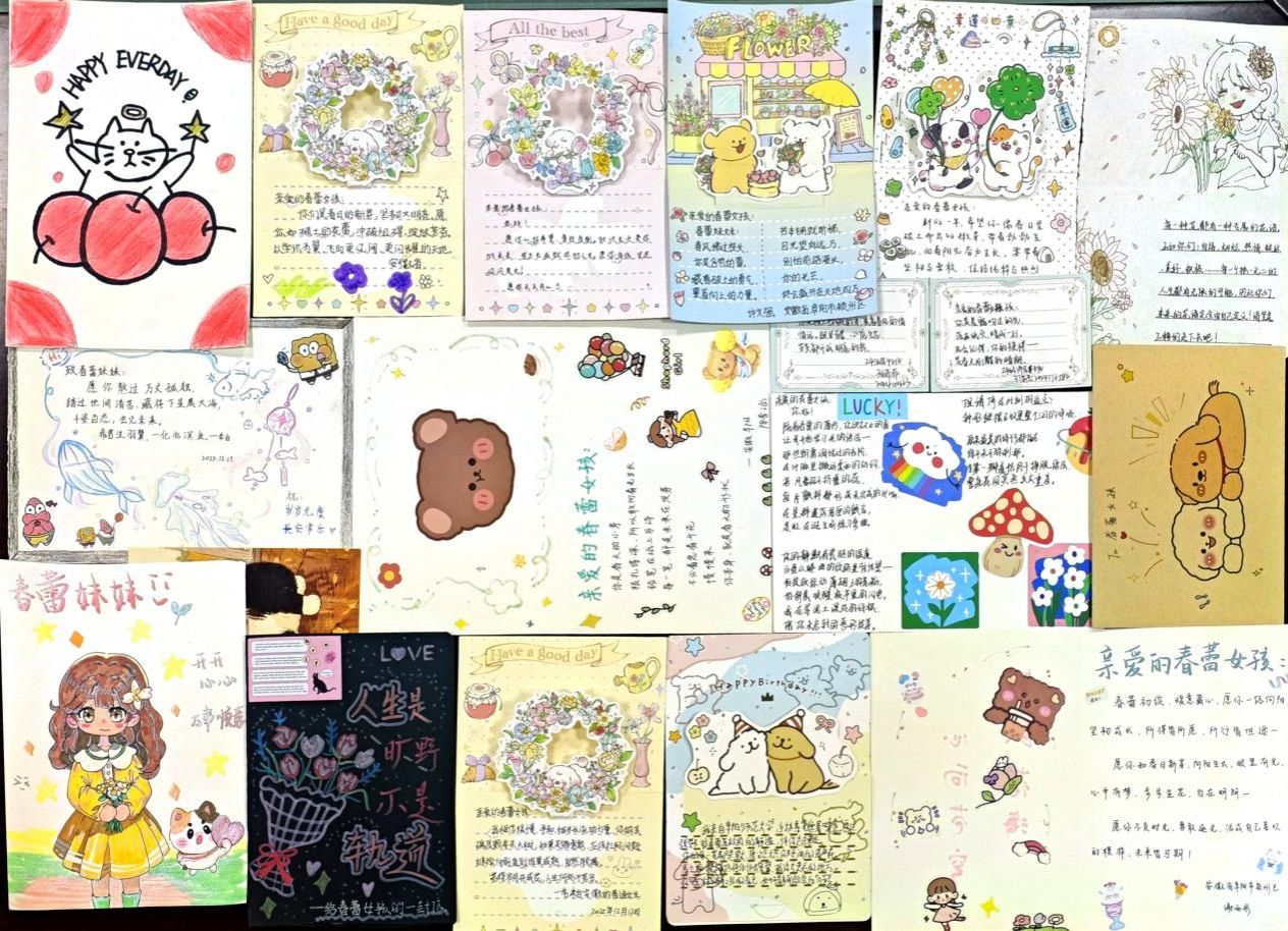 活动期间,同学们积极参与,纷纷拿起画笔和彩纸,精心设计贺卡。作品内容丰富多样,有的绘制了温暖的插画,有的写下真挚的小诗,有的分享自己的成长故事,用朴实而有力的语言为春蕾女孩送上励志与祝福。一张张贺卡,承载的是同学们对春蕾女孩的牵挂与祝福;一句句寄语,凝聚的是青年一代的责任与担当。