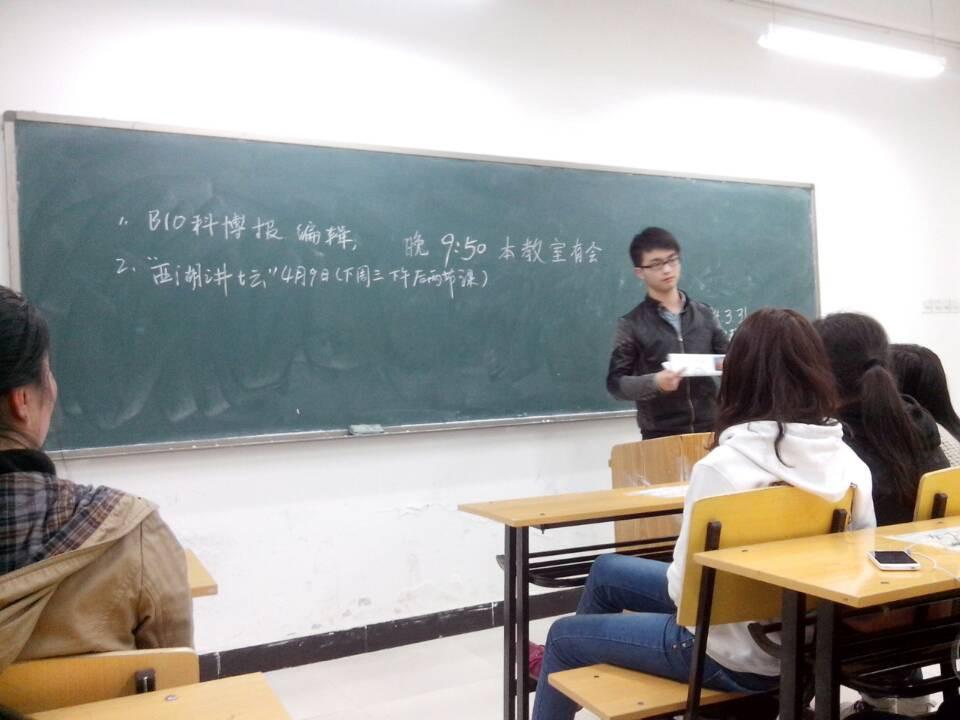 2014年3月31日晚9:40,BIO科博学会在教学D楼104教室召开期中会议。会议在社长童志斌的发言中拉开序幕。