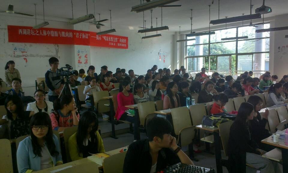 由我校科研处、党委宣传部主办,BIO科博学会承办的阜阳师范学院2014年第3期“西湖讲坛”于4月9日下午16:20在南平101教室隆重开幕。生命科学学院姬云涛博士以“人体中脂肪与肌肉的君子协议”为主题,为同学们献上了一场有教育意义又不失幽默的精彩讲座。