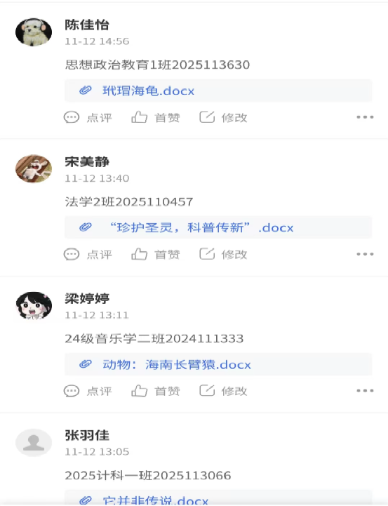 活动当日,同学们积极响应,通过网络自主选择一种濒危动物,查找相关图片,深入了解其生存现状与保护意义,撰写100字以内的介绍文字与宣传标语,以Word文档形式提交作品。本次活动通过线上互动与科普传播相结合的方式,营造了人与动物和谐共生的良好校园文化氛围,增强了学生的生态保护意识与社会责任感。不少作品既展现了物种的独特价值,又传递出保护濒危动物的迫切性,体现了青年学生对自然生态的关注与担当。