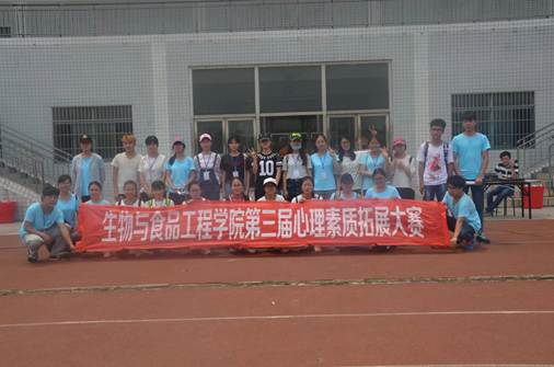 2017年6月3日上午9:00,生物与食品工程学院心理委员联合会举办的第三届心理素质拓展大赛在我校风雨操场隆重举行,校学生处副处长宋东锋老师,生物与食品工程学院党总支书记程建书记,校学生工作处刘时勇老师、生物与食品工程学院辅导员王丛丛老师,心理指导员李婷婷老师参加了此次活动的开幕式并担任团队展示的评委老师。2015级与2016级各班分派代表队参加此次比赛。比赛在街舞社精彩的热舞之后正式拉开了帷幕,在主持人的精彩解说下,各个班级分别向我们展示了他们精心准备的团体展示,有唱歌的有跳舞的,无一不在散发着独属于他们的青春活力与朝气,更向我们展示了他们每个班集体的凝聚力和团结友爱,让我们看到了阜阳师范生工院学子的风采!