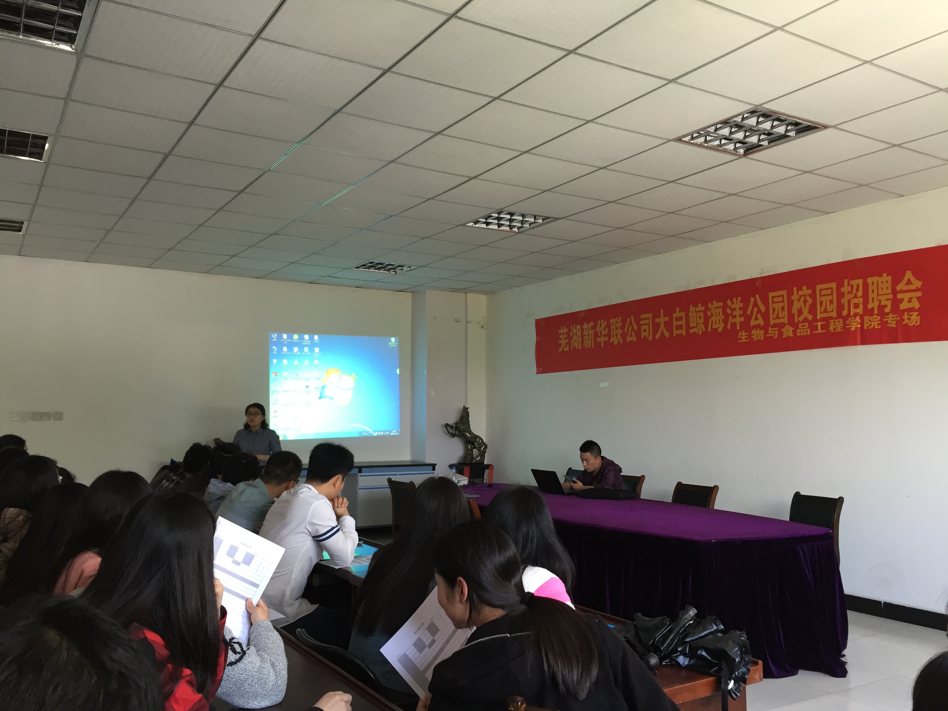 会上,芜湖新华联公司大白鲸海洋公园人事部经理吴炜对简介、公司发展、招聘岗位、工资待遇等方面进行详细介绍,办公室主任路磊和艺术总监郭鹏对现场投简历的毕业生进行面试。