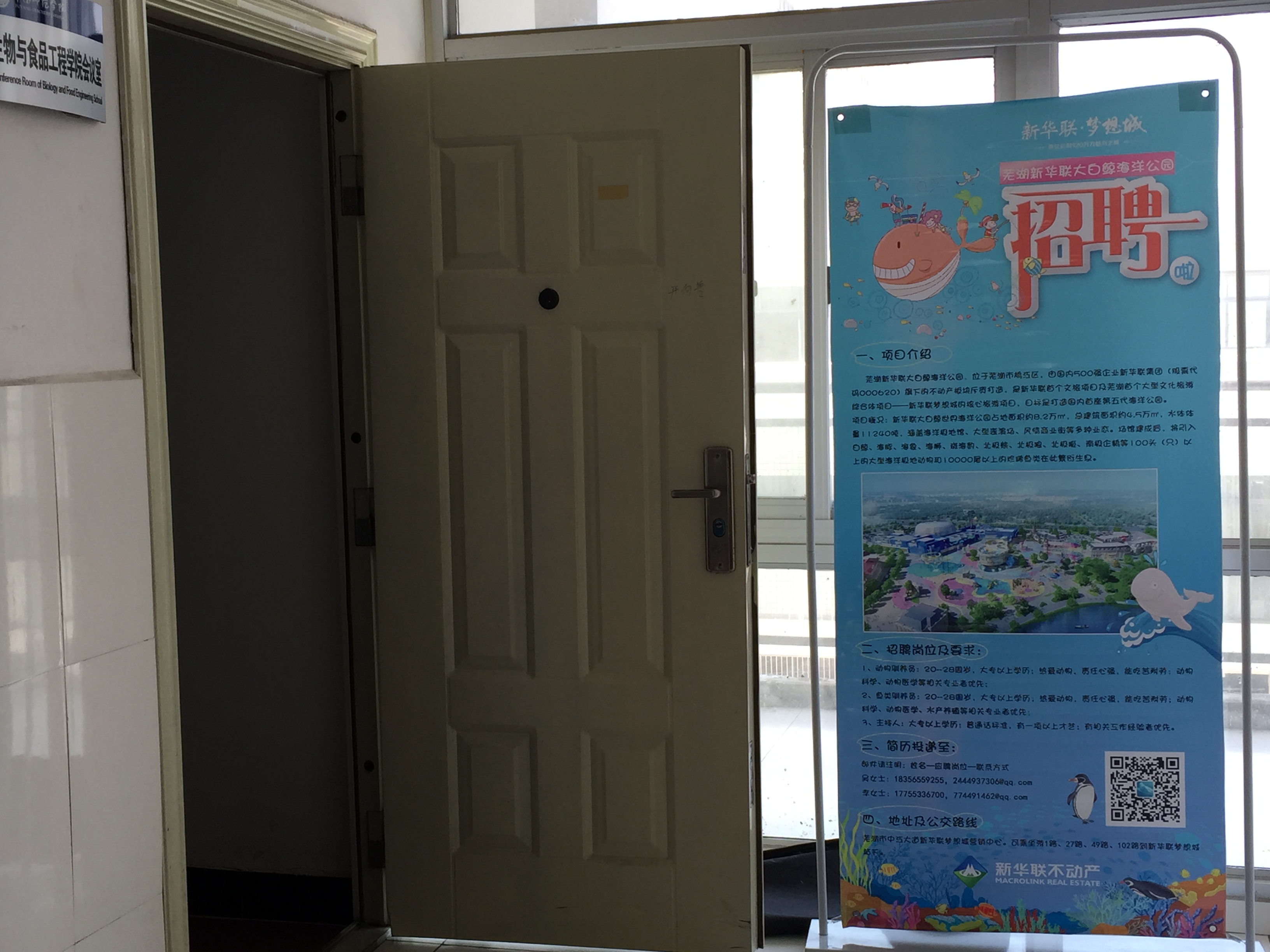 2016年9月18日下午14:00,生物与食品工程学院于西湖校区教学E楼302会议室举办了专场招聘会--芜湖新华联公司大白鲸海洋公园校园招聘,会议由学院就业指导员范亚丽老师主持,生物科学专业与动物科学专业59名毕业生参加会议。