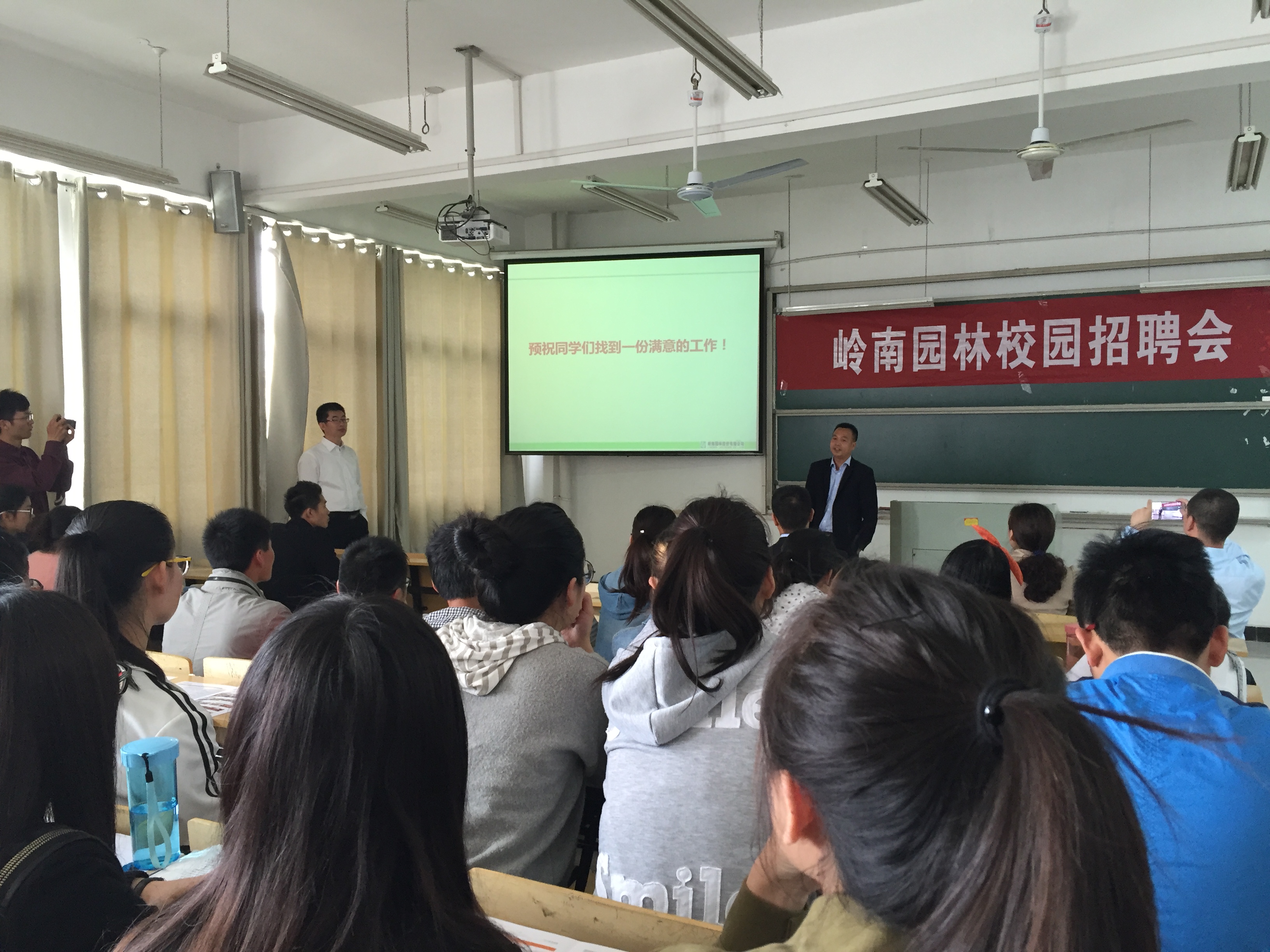 会上,上市公司岭南园林股份有限公司人事部经理通过视频与PPT详细介绍了岭南园林的公司简介、主营业务、招聘岗位及任职要求、待遇等,并进行了现场面试。