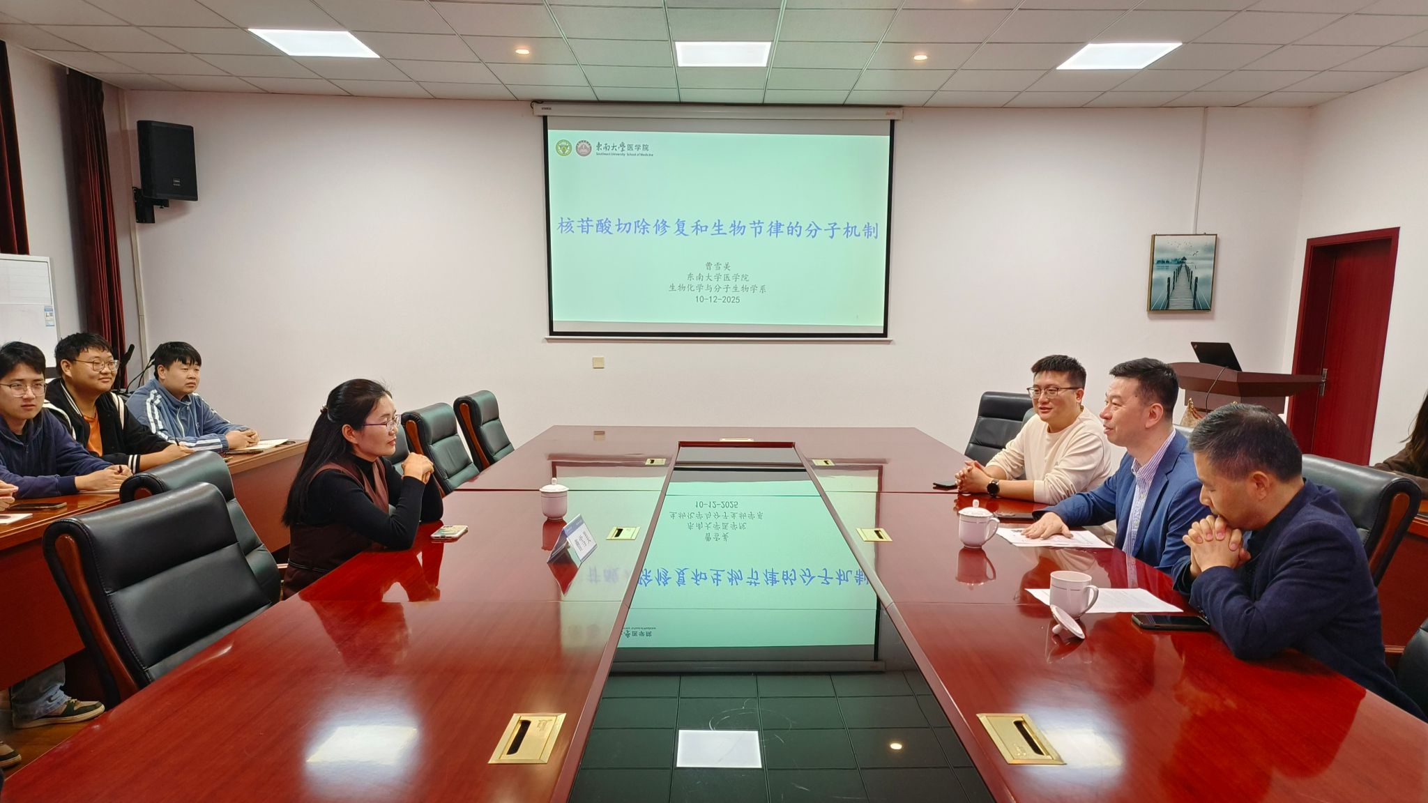 曹雪美博士,我校2009级校友、现任职于东南大学,教授、博导,是一位在生物节律和DNA损伤修复领域具有深厚研究背景的专家。在报告中,曹博士深入浅出地介绍了核苷酸切除修复的分子机制,特别是EdU损伤DNA的修复过程以及开发的体外XR-seq技术。此外,她还详细阐述了生物钟抑制相位的分子机制,包括激酶CK1和转录抑制因子CBF1在生物节律中的作用。