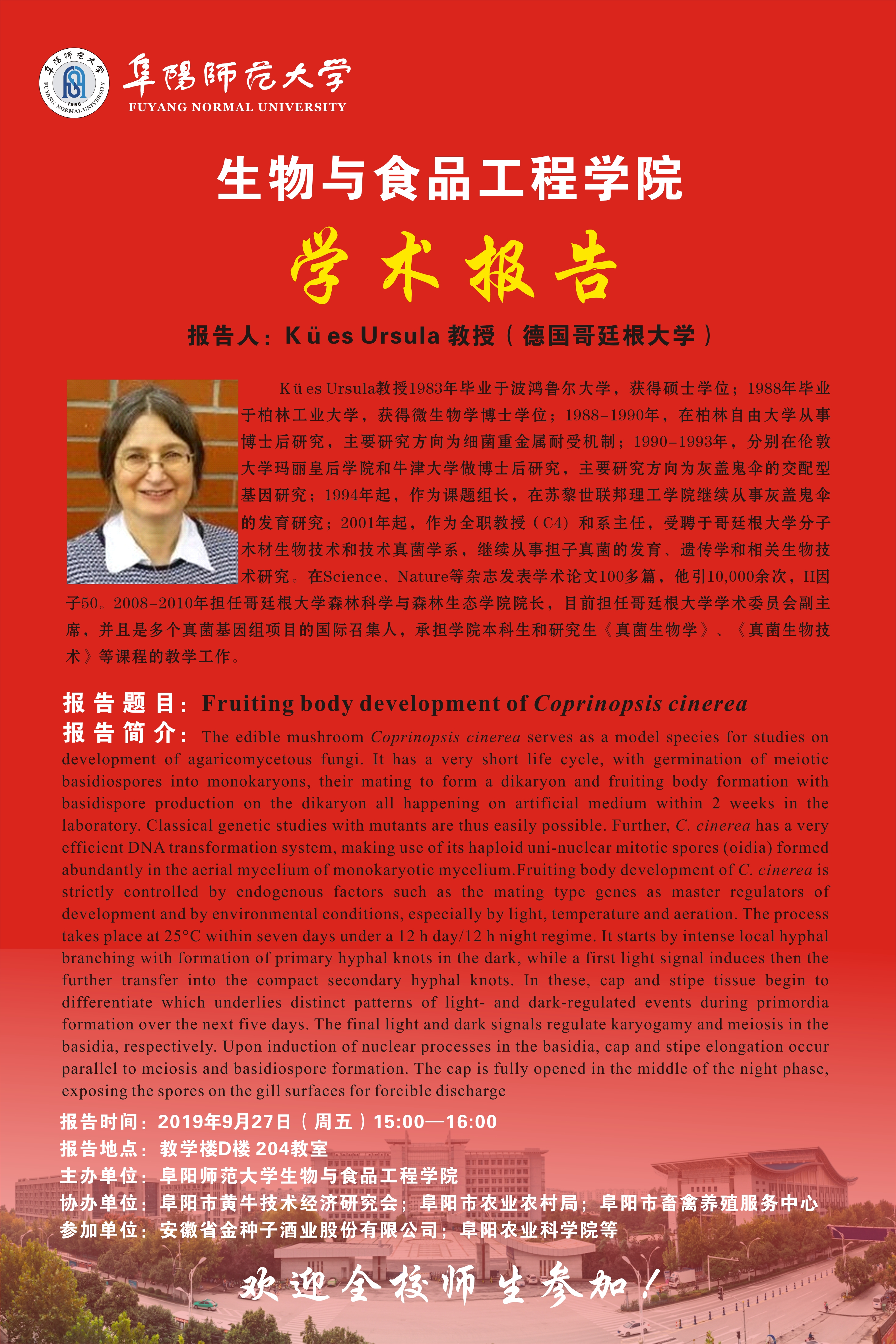 Kües Ursula教授1983年毕业于波鸿鲁尔大学,获得硕士学位;1988年毕业于柏林工业大学,获得微生物学博士学位;1988-1990年,在柏林自由大学从事博士后研究,主要研究方向为细菌重金属耐受机制;1990-1993年,分别在伦敦大学玛丽皇后学院和牛津大学做博士后研究,主要研究方向为灰盖鬼伞的交配型基因研究;1994年起,作为课题组长,在苏黎世联邦理工学院继续从事灰盖鬼伞的发育研究;2001年起,作为全职教授(C4)和系主任,受聘于哥廷根大学分子木材生物技术和技术真菌学系,继续从事担子真菌的发育、遗传学和相关生物技术研究。在Science、Nature等杂志发表学术论文100多篇,他引10,000余次,H因子50。2008-2010年担任哥廷根大学森林科学与森林生态学院院长,目前担任哥廷根大学学术委员会副主席,并且是多个真菌基因组项目的国际召集人,承担学院本科生和研究生《真菌生物学》、《真菌生物技术》等课程的教学工作。