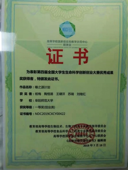 全国大学生生命科学创新创业大赛由教育部高等学校生物技术、生物工程类专业教学指导委员会,教育部高等学校食品科学与工程类专业教学指导委员会,高等学校国家级实验教学示范中心联席会,《高校生物学教学研究》编辑部等联合主办。自2016年创办以来,已成功举办四届比赛,是当前国内高校生命科学领域参赛范围最广、影响力最大的一项全国性赛事。本次大赛于2019年1月正式启动,6个月时间历经初赛、复赛、决赛、路演四个阶段。共有全国291所高校、3987个项目、19844名师生参赛,经过初赛与复赛,共有168所高校的425项作品进入公开决赛。我校食品与生物工程学院由屈长青老师和杨京霞老师指导,杨梅、陶恒港、王啸洋、苏瑞和刘继红等5名同学组成的椿之源农业科技团队,顺利进入决赛并最终获得创业组一等奖。
