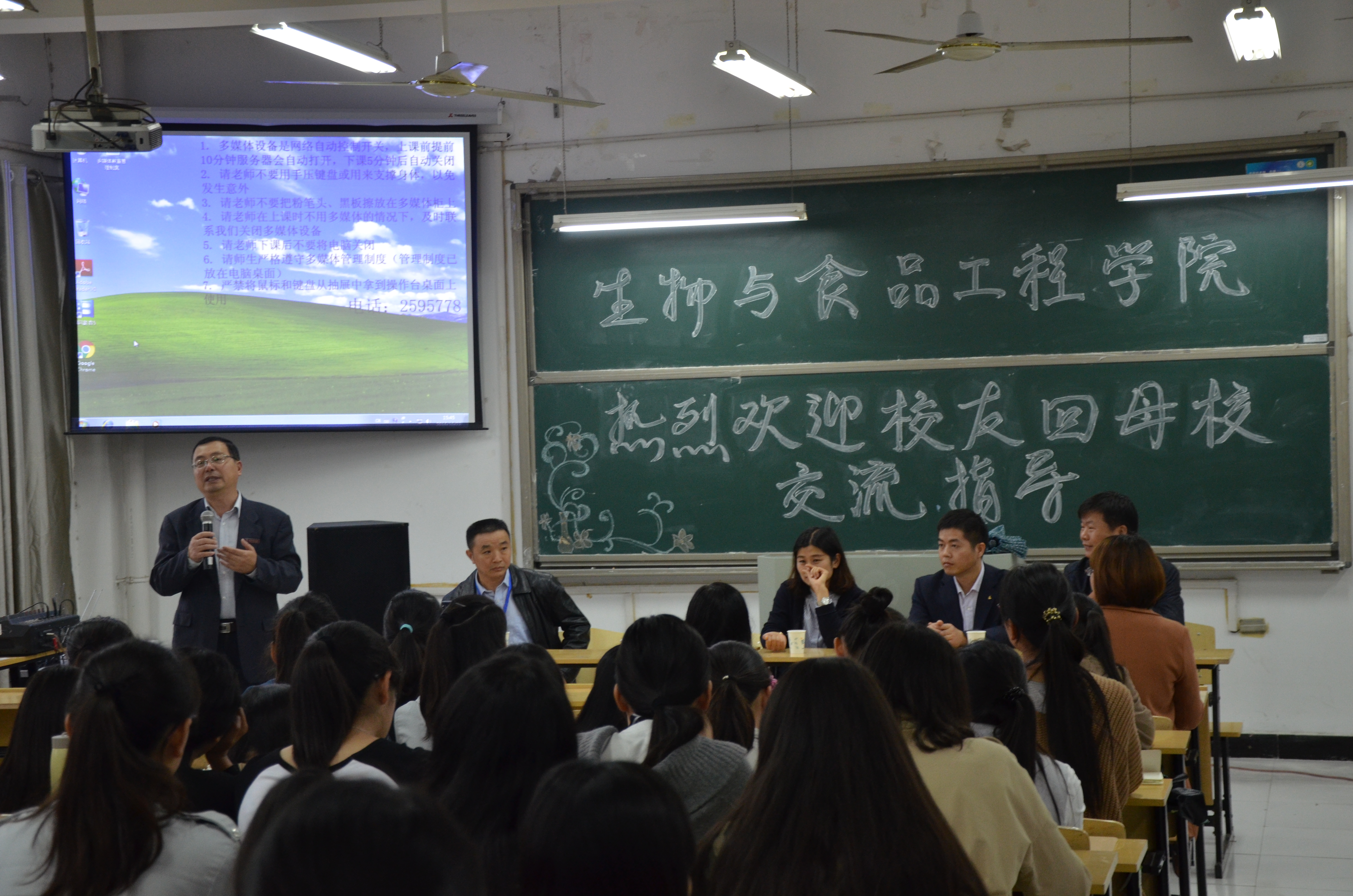 崔亚东院长首先致欢迎词,代表生物与食品工程学院全体师生欢迎四位的到来,感谢他们能在工作中抽出时间来参加这次交流会,并向参与这次交流会的同学介绍四位优秀校友代表所取得的成绩。