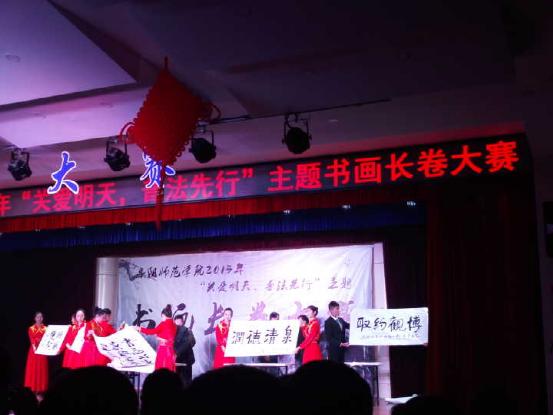 本次比赛分为两个环节。第一节:个展风采。每个学院将自己的书画自己介绍在台上展示!我院由余明月同学作介绍,余明月同学用平实的话语,融入充分的感情,将我院的书画所赋予的意义讲解的十分到位!她讲出了我院书画的精髓,道出了我院书画所寄予的深切期盼!第二节:现场展示。每个学院派出一个代表限时5分钟现场书写毛笔字!我院孙智豪同学负责在台上现场书写。孙智豪同学不急不慌的上台,从容镇静的书写了“正身明法”四个字,这四个字,写出了生物与食品工程学院的气势以及对于“关爱明天,普法先行”活动的大力支持!现场还邀请了退休老教师,以及原图书馆馆长进行现场书法的书写!老师们对于书法都抱有极大的热情!书写了一幅幅苍劲有力的诗篇! 经过激烈的比拼,我院以79.92的分数拿到了三等奖!