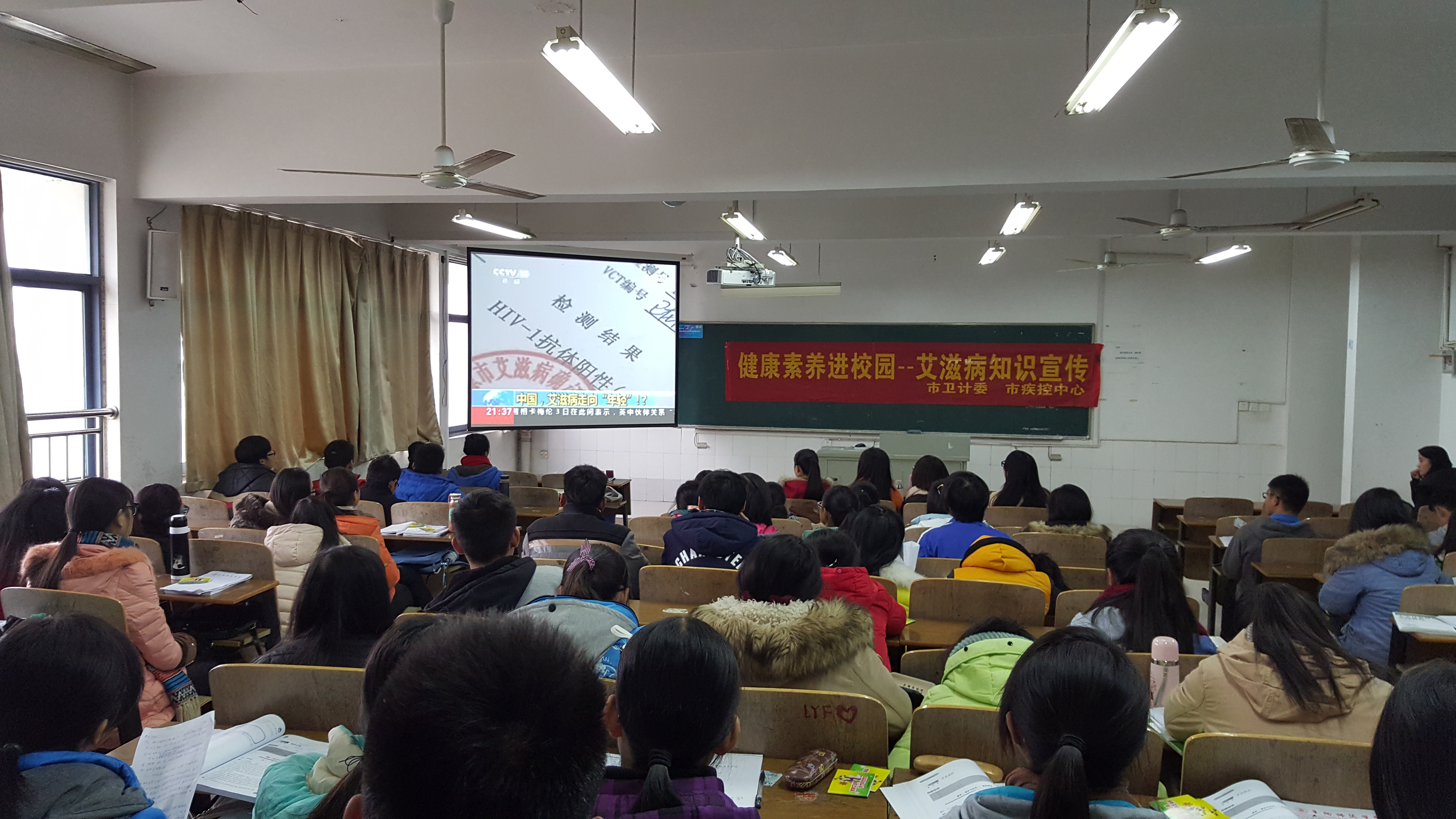 为提高学生自我保护意识,普及预防艾滋病知识,引导学生正确对待、预防艾滋病,校团委、市计委、市疾控中心与生物与食品工程学院联合在2015年11月27日下午举办了“健康素养进校园”--艾滋病知识宣传的讲座。