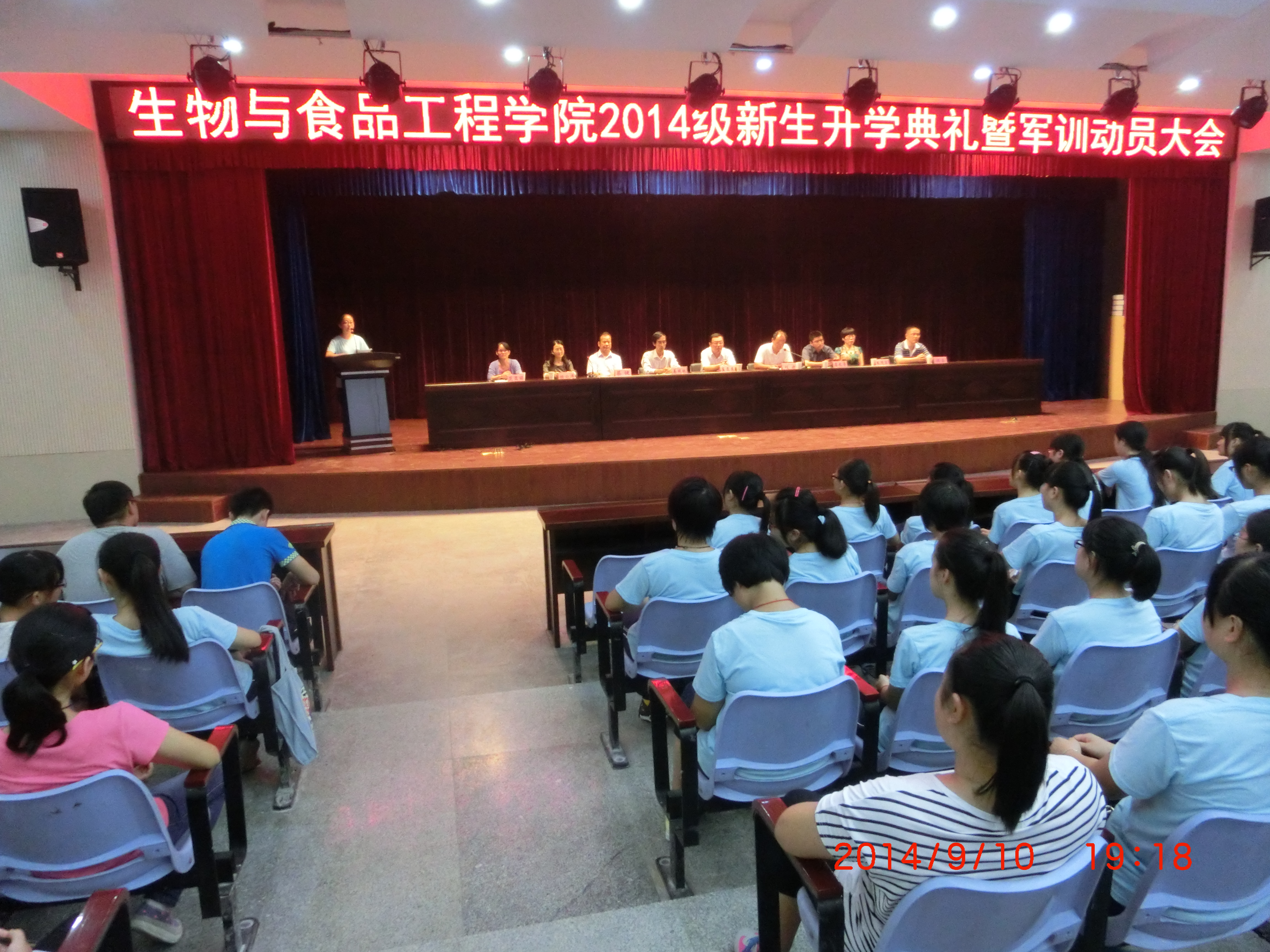 朗朗金秋,丹桂飘香。9月10日晚上6:30,生物与食品工程学院2014级新生开学典礼暨军训动员大会在西湖校区小礼堂隆重举行。生物与食品工程学院院长崔亚东、党总支书记程建、副院长姜双林、各教研室主任及268名新生参加了开学典礼。开学典礼由党总支书记程建主持。