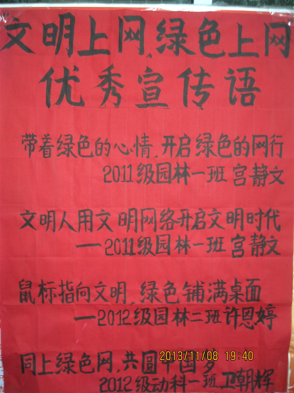 举办校园网络文明宣传语征集活动。为进一步加强校园网络文明建设的宣传力度,11月1日-11月8日,学院发起校园网络文明建设宣传语征集活动。本次活动共征集到宣传语59个,并评选出6个具有代表性的优秀宣传语,鼓励更多同学都能参与到活动中来,自觉践行网络文明。