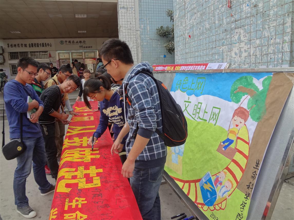 举办“文明上网、从我做起”签名仪式。10月28日中午,学院青年志愿者协会和学生会生活部在西湖校区食堂北门举行了网络文明活动的签名仪式,倡导全校大学生守法上网、文明上网、安全上网、绿色上网、健康上网,号召同学们信守网络诚信,从我做起,从现在做起,文明上网,上文明网。活动得到了同学们的积极响应,大家纷纷踊跃的参加了签名仪式,在宣传横幅上签下自己的名字,并承诺要用实际行动践行网络文明。