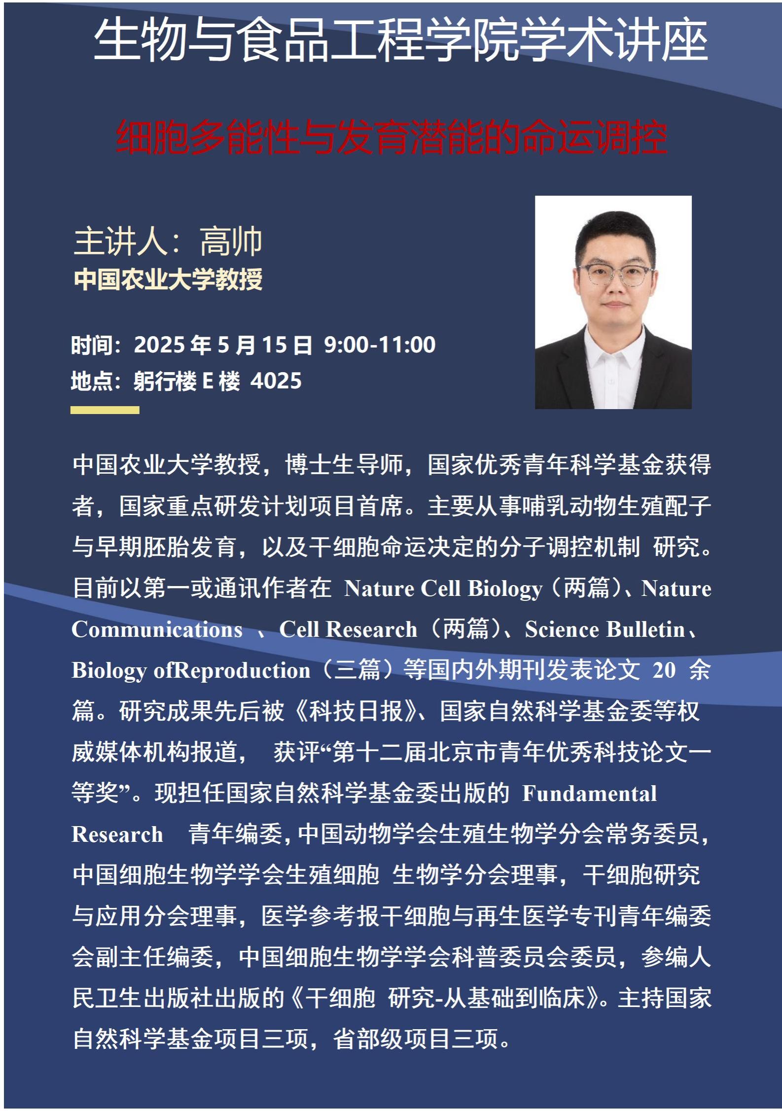 生物与食品工程学院讲座通告——细胞多能性与发育潜能的命运调控