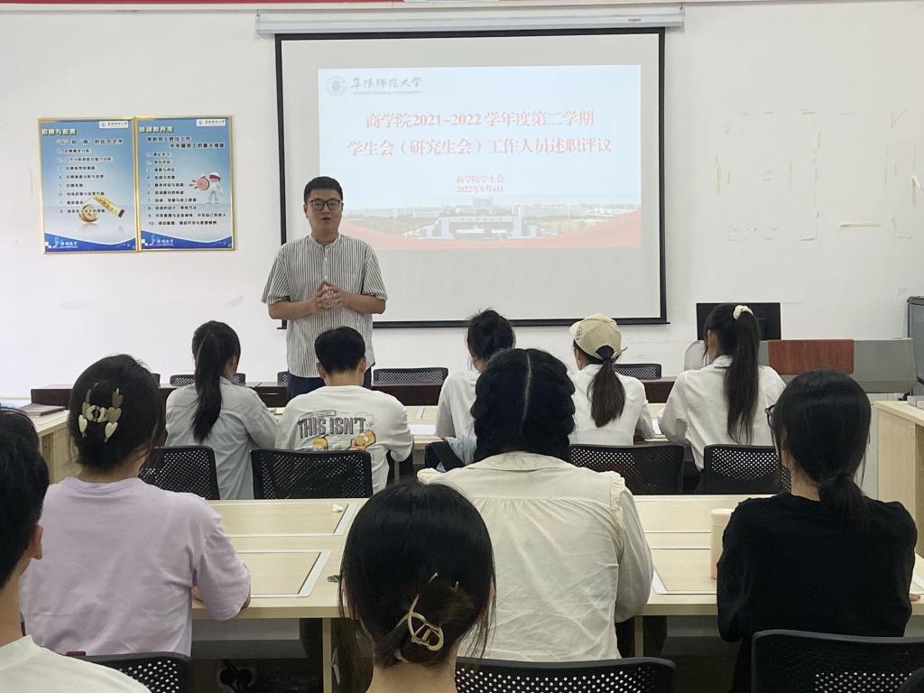 根据《关于推动学生会(研究生会)深化改革的若干意见》文件精神,按照《阜阳师范大学学生会深化改革落实方案》《阜阳师范大学学生会工作考核实施细则(试行)》有关规定。9月6日,商学院召开2021-2022学年度第二学期学生会工作人员述职评议会,学院分团委负责人张宇、辅导员冉慧宇、院学生会骨干、学生代表参加会议。