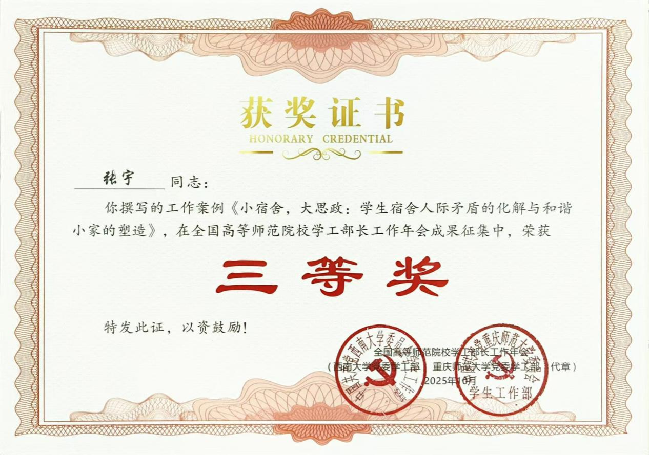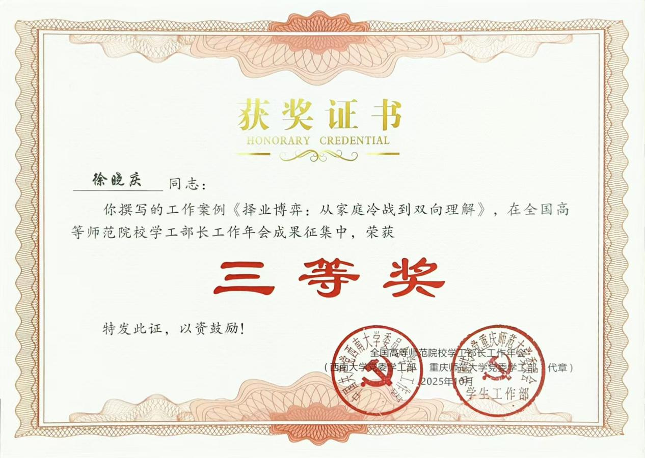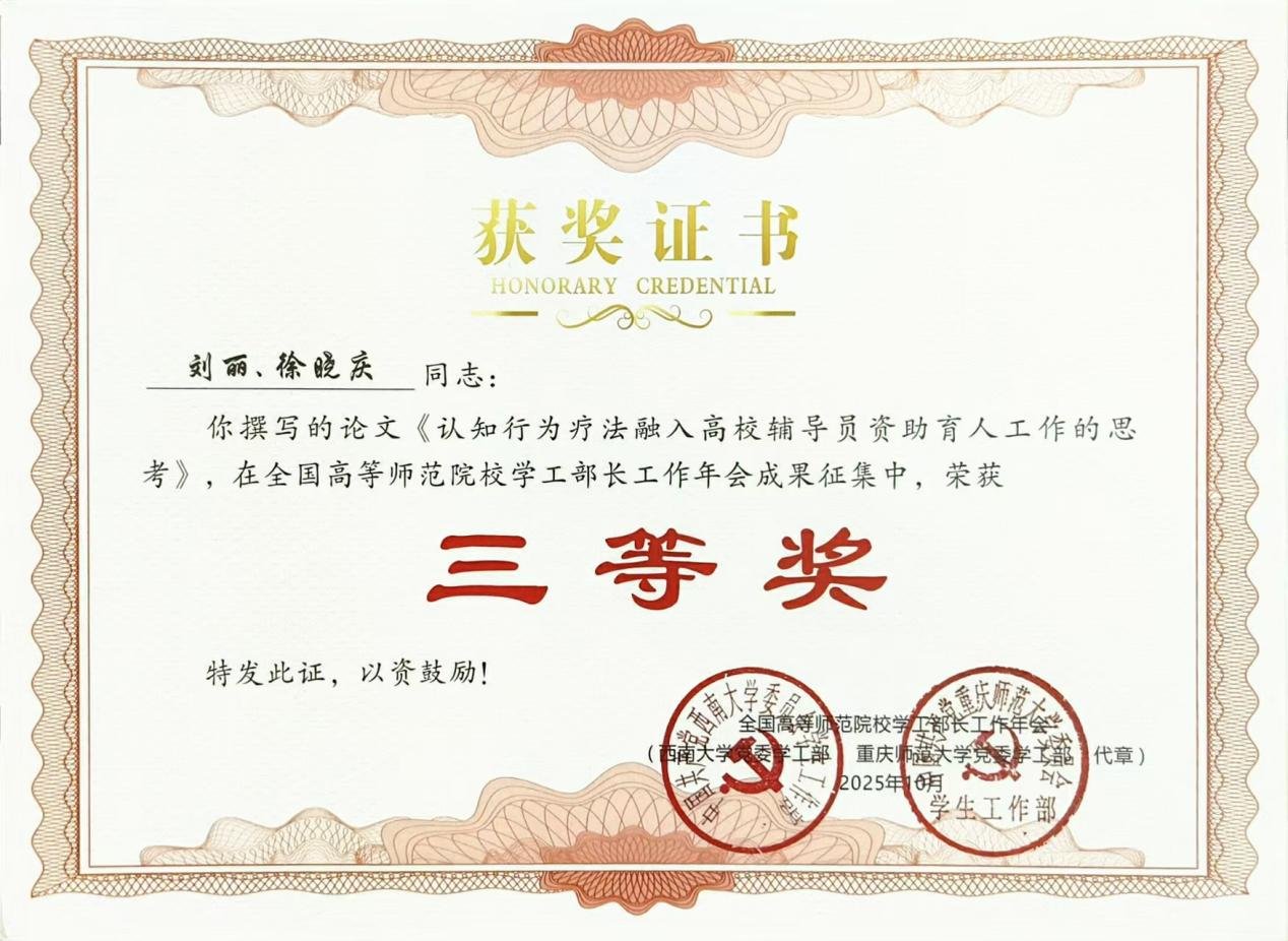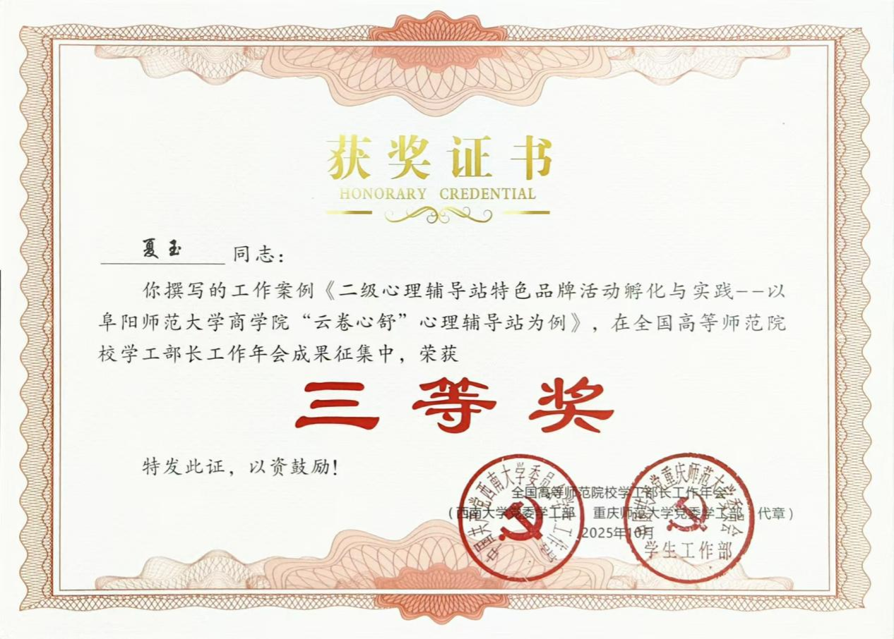 活动由重庆师范大学主办,围绕“筑梦教育强国,共担教育使命”主题,面向全国高等师范院校思政工作专职人员征集论文与工作案例。商学院高度重视此次成果征集,认真组织全体辅导员参与申报,共推选成果21项。经组委会评选,张宇老师撰写的《“四事四权”工作法融入师范院校“一站式”学生社区管理的研究》获论文类二等奖,刘丽与徐晓庆老师合作撰写的《认知行为疗法融入高校辅导员资助育人工作的思考》获论文类三等奖;徐晓庆、夏玉、刘丽撰写的工作案例《择业博弈:从家庭冷战到双向理解》《二级心理辅导站特色品牌活动孵化与实践--以阜阳师范大学商学院“云卷心舒”心理辅导站为例》《小宿舍,大思政:学生宿舍人际矛盾的化解与和谐小家的塑造》获三等奖。