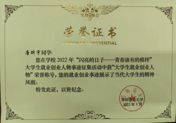 近期,我校组织开展了“闪亮的日子——青春该有的模样”大学生就业创业人物事迹征集活动,我院2020级财务管理2班唐昕宇同学脱颖而出、榜上有名,获评“大学生就业创业人物”(军营大学生战士类别)荣誉称号。