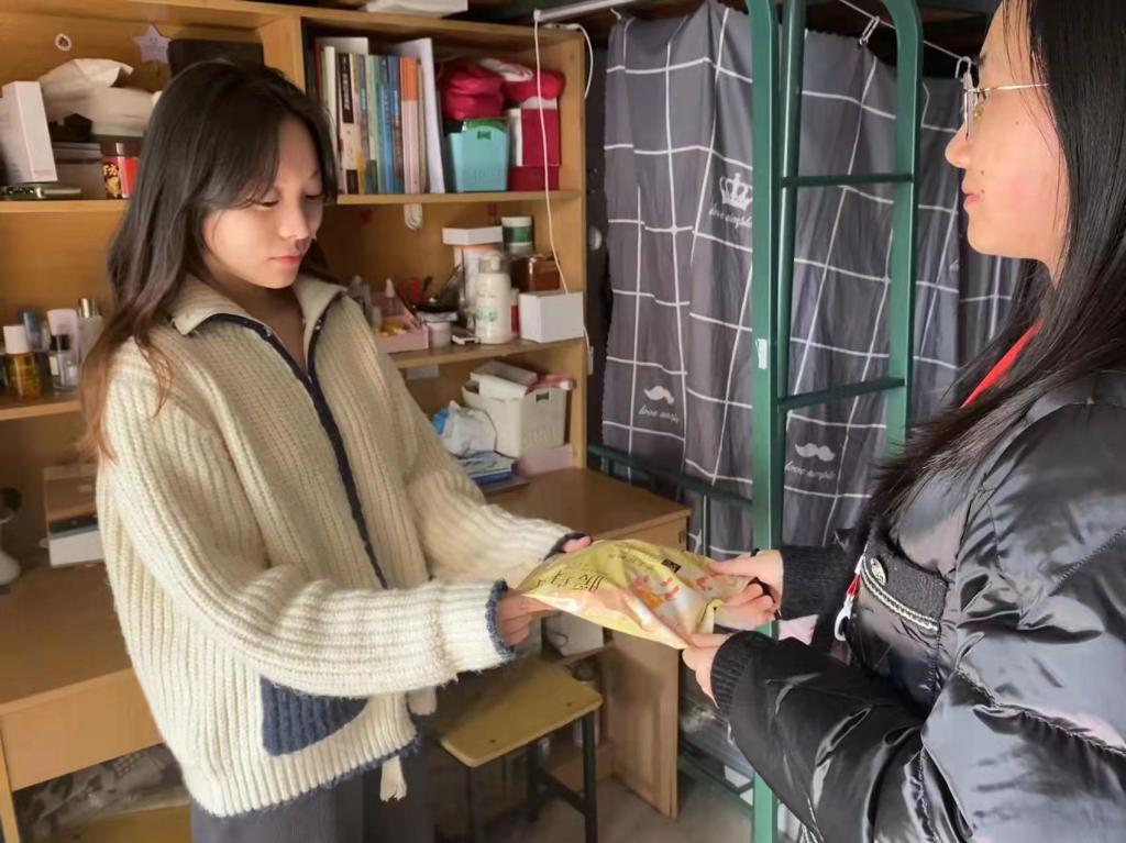 图1.辅导员进宿舍为考研学子送暖身贴