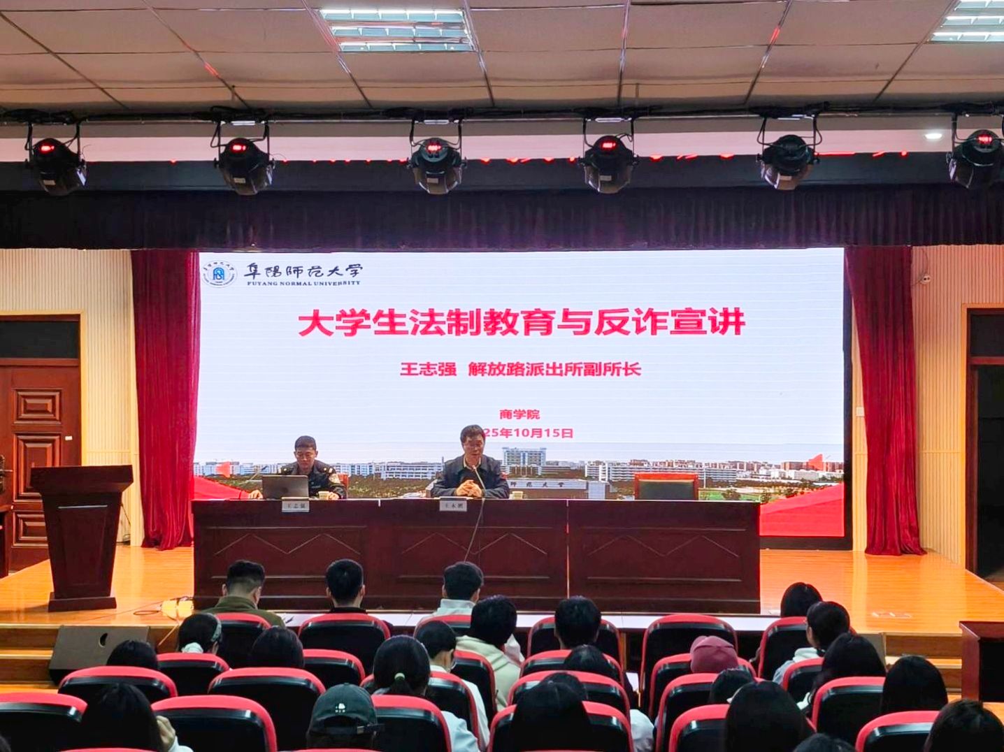 为进一步增强2025级新生的行为规范意识与安全防范能力,筑牢校园安全防线,10月15日,学院邀请解放路派出所走进清河校区,联合开展法治教育与反诈宣讲活动。活动由学院党委副书记王永刚主持,学院全体专兼职辅导员、学生会骨干及2025级全体新生参加。