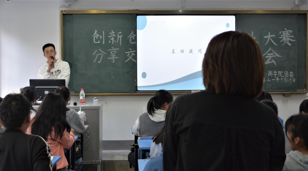 第二个环节为互动提问环节。同学们积极互动,踊跃提问,现场气氛热烈,展现出对创新创业类大赛的浓厚兴趣,为以后赛事的参加积累了充分的经验,也提振了信心。此外,荣传波还交流了大学期间的心得体会,勉励学弟学妹扎实学好专业知识,积极参加各项活动,在大学期间争取综合全面发展。