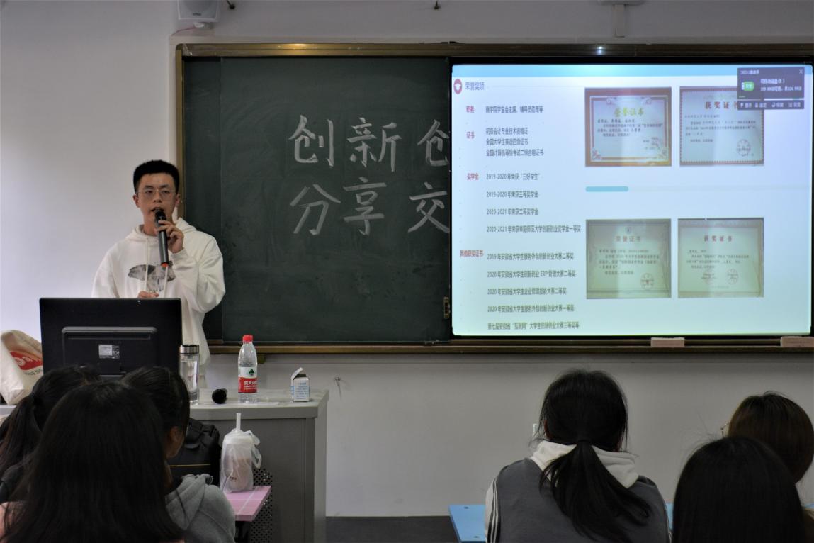 交流分享会分为两个环节,第一个环节由荣传波同学进行PPT宣讲,他主要从成果展示、创新创业、服务外包、四年展望等四个方面向同学们介绍了创新创业比赛相关知识,交流分享获奖经验,特别以安徽省服务外包大赛为例,详细讲述了比赛前期准备阶段、活动过程及结尾工作可能会遇到的各种困难和方法建议,帮助同学们对创新创业类大赛有了更全面的了解和更清晰的认识。