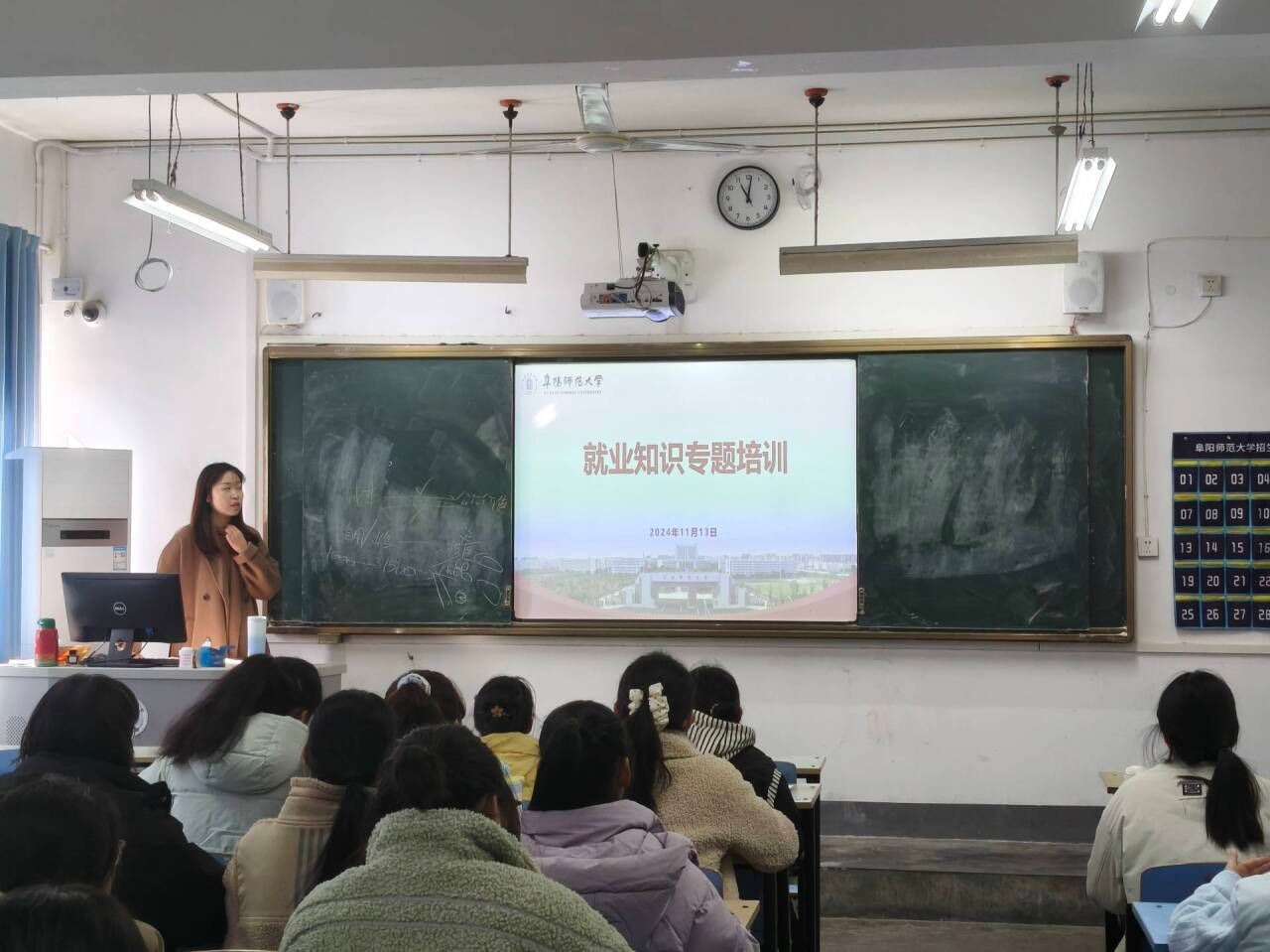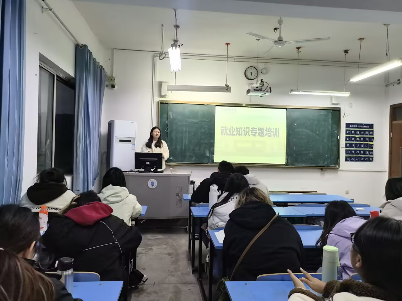 在就业知识模块,培训内容涵盖简历撰写、面试技巧与职业规划等实用技能,为毕业生提升求职竞争力提供了具体指导。同时,讲座系统解读了就业创业相关政策,对基层就业、创业担保贷款等学生关切的信息进行了说明与答疑。
