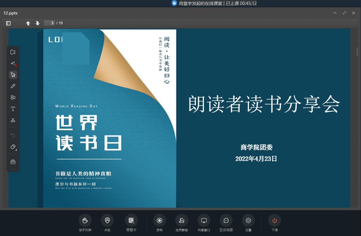 根据疫情防控要求,活动以线上读书分享会的形式开展,各班级团支部组织广大学生线上进行观摩。活动之前,各班级在同学们积极报名基础上,择优遴选“朗读者”参加本次分享交流。他们通过朗读经典书籍的节选内容、分享阅读品鉴的思考体悟,声情并茂地表达观点、抒发情感。《苦难辉煌》令人震撼,“朗读者”以激情澎拜的语言,引领听众体会到中华民族为什么能自强不息、什么叫做信仰、什么叫做革命者、先辈为什么能建立新中国;《活着》引发思考,“朗读者”宛如“导游”,引导听众认识到人生就像激流,要越过险滩、淌过河岸,绕过明暗不定的礁石,原来被苦难堆砌但依旧顽强、乐观,便是“活着”的姿态;《靠自己去成功》激起共鸣,“朗读者”转换角色用“家长”的口吻,教育成长道路上的儿女遇到困难和挫折时,不要畏惧与害怕,要坚定勇敢的迎接挑战,以“平常心”对待生活带来的一切。经评审,2019级人力资源管理1班谢凤雪、2021级财务管理2班汤杰等11名同学获得优秀“朗读者”称号。