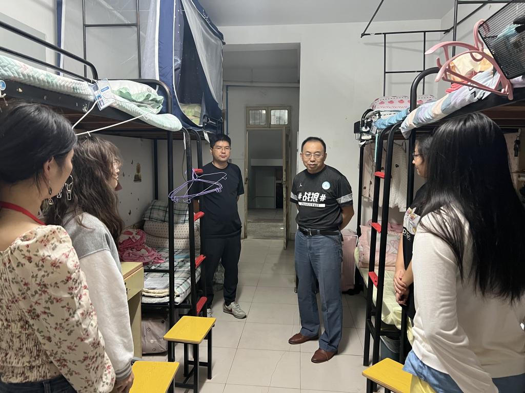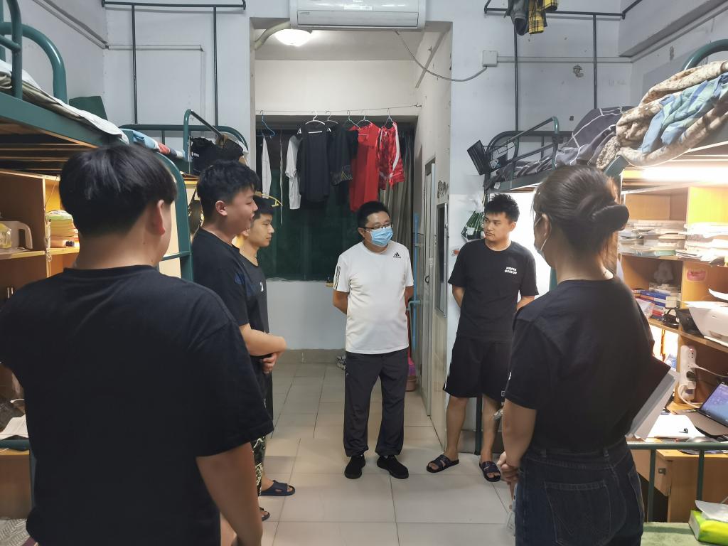 为全面贯彻、深入推进学校疫情防控工作各项要求,进一步了解学生的生活情况、学习状态、思想动态,针对性做好学生教育、服务、管理工作,按照属地规定校园封闭期间,我院党委书记宋东锋、院长朱剑峰、副书记王永刚带领两校区辅导员下沉一线,每天坚持常态化走访学生寝室。