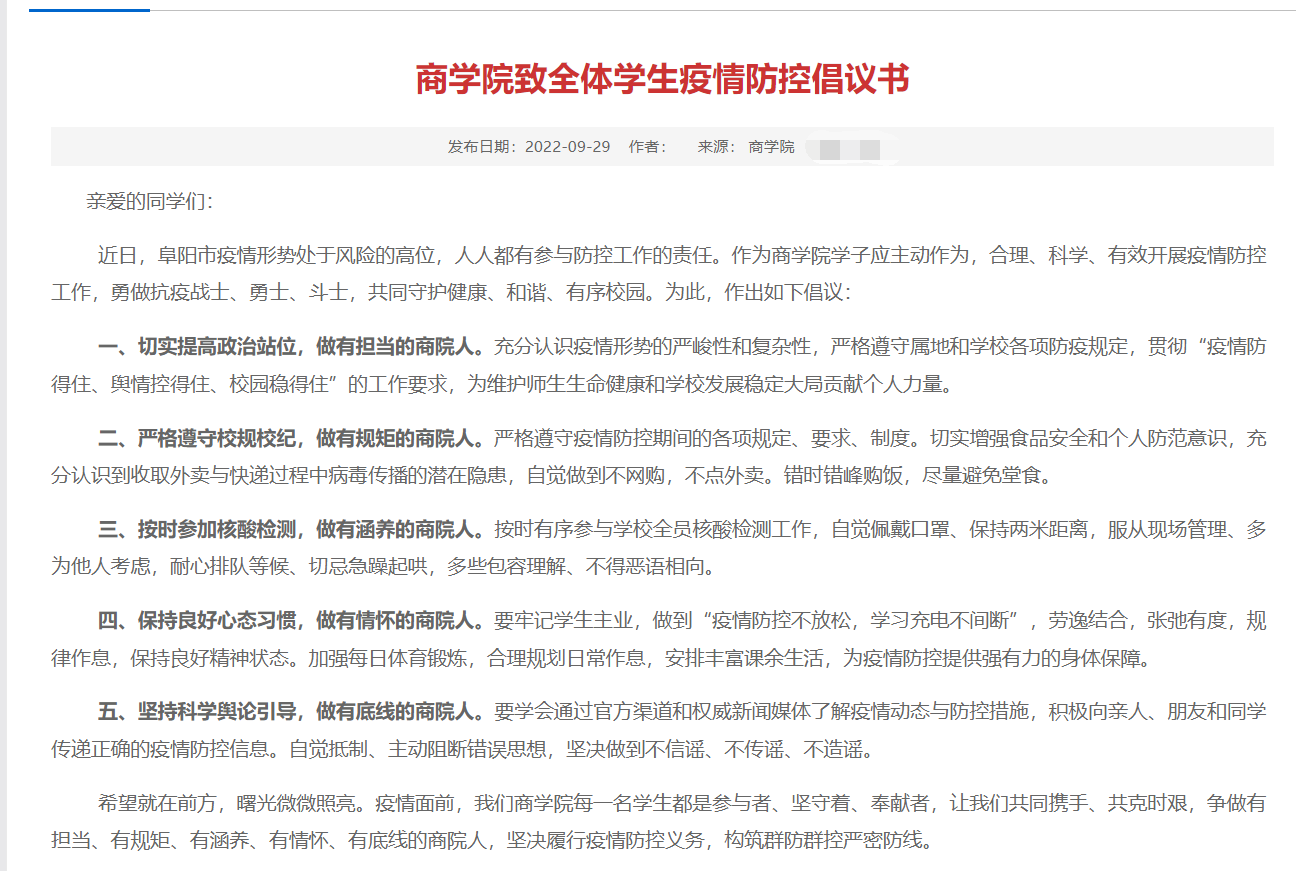 突出人文关怀,强化宣传引导。学院高度重视、精心设计、认真组织学校“喜迎二十欢度国庆节”工作要求,国庆节期间开展“青春向党 欢度国庆”系列活动30余场次,吸引1700余人次参与,让校园封控管理期间的学生教育“活起来”“动起来”,充分体现学院的人文关怀。通过学院网站、工作群、公众号等多种形式及时对官方渠道和权威新闻媒体的疫情动态与防控措施进行宣传。向全院学生发布《商学院致全体学生疫情防控倡议书》,倡议全体学生争做有担当、有规矩、有涵养、有情怀、有底线的商院人,坚决履行疫情防控义务,构筑群防群控严密防线。