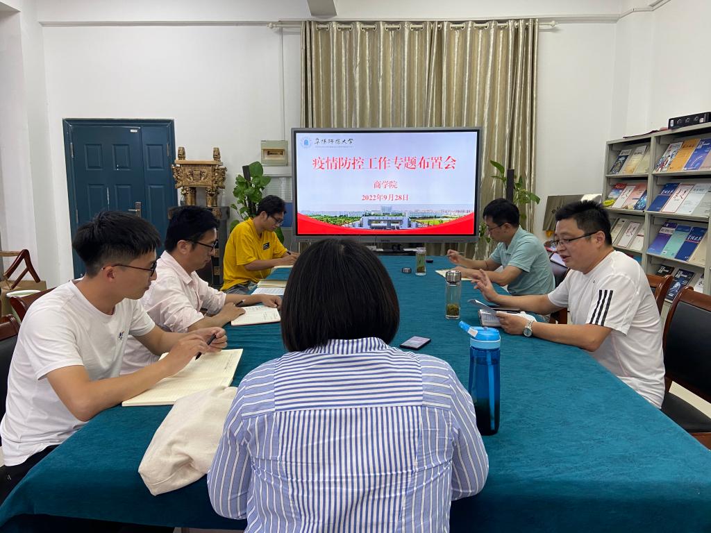 加强组织领导,提高思想认识。9月25日,学院党委书记宋东锋紧急召开全体专兼职辅导员会议,通报疫情形势,查摆漏洞短板,压实各方责任,明确防控要求。9月28日,线下、线上召开两校区疫情防控工作专题布置会,全面传达落实学校疫情防控工作专题部署会精神,贯彻“疫情防得住、舆情控得住、校园稳得住”的部署要求及属地相关工作要求。9月30日、10月1日,紧抓“国家烈士纪念日”、国庆节重要时间节点,宋东锋分别以“缅怀抗疫英烈踔厉奋发弘扬抗疫精神笃行不怠”“韶华不负强国有我”为题,为学生党员、班团干部、学生骨干代表上了一堂抗疫思政课,勉励同学们在疫情期间充分发挥党员先锋作用和学生骨干示范引领作用。