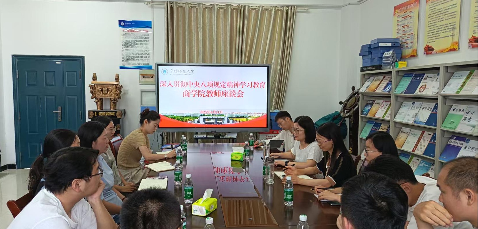 为深入贯彻中央八项规定精神,带头走好新时代党的群众路线,6月11日,学院院长张雪梅主持召开深入贯彻中央八项规定精神教师座谈会,学术副院长张克荣、教师代表、人事秘书等参加会议。