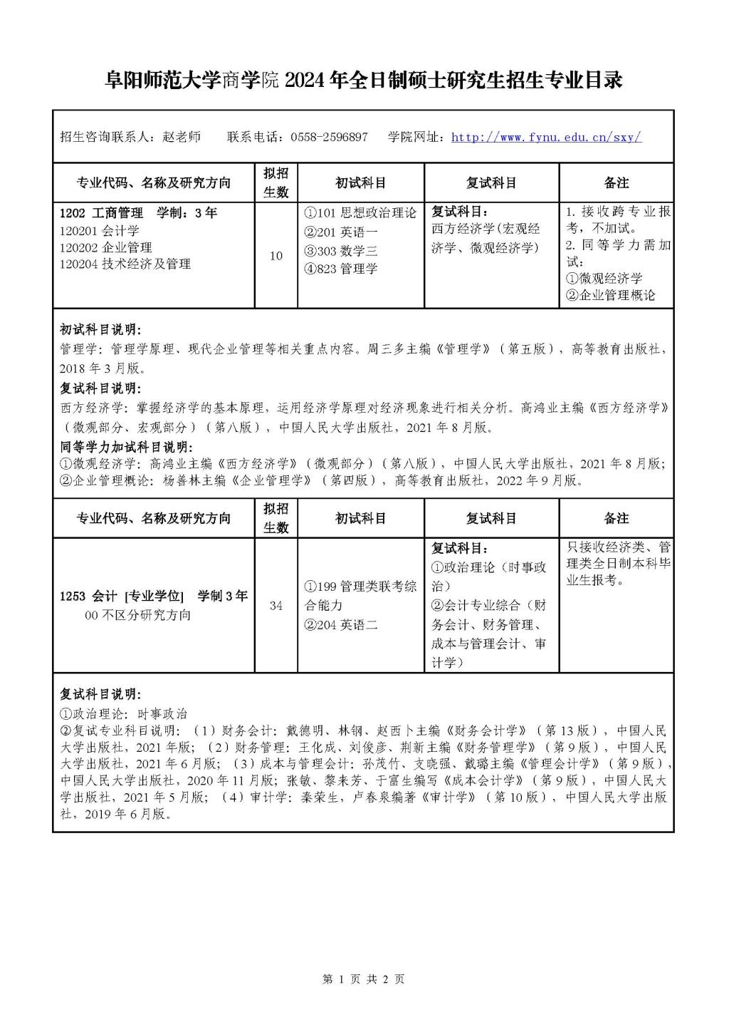 阜阳师范大学商学院2024年全日制硕士研究生招生专业目录