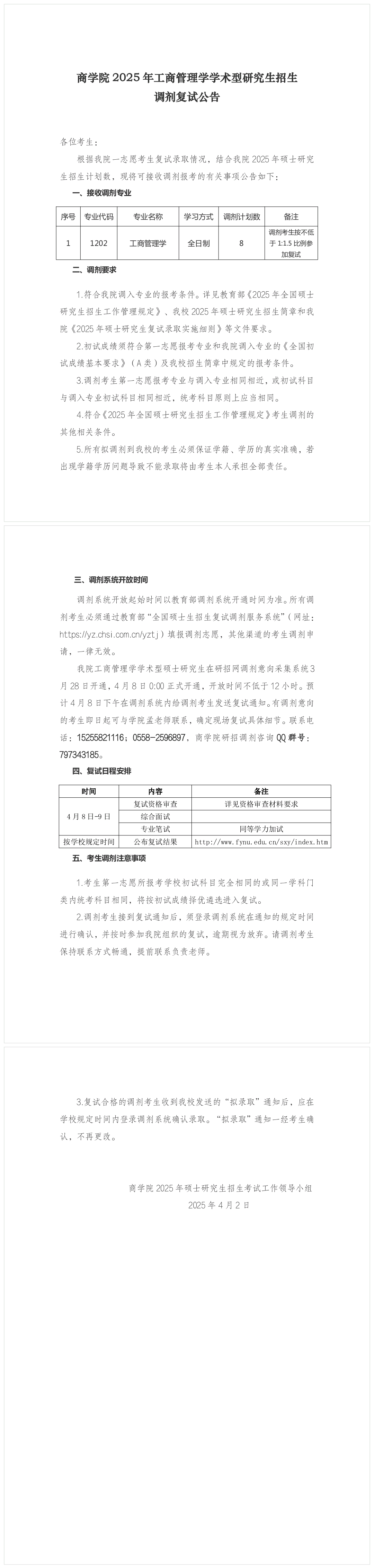 商学院2025年工商管理学学术型研究生招生调剂复试公告