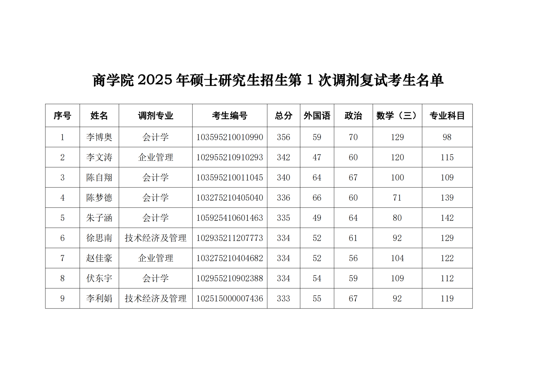 商学院2025年硕士研究生招生第1次调剂复试考生名单