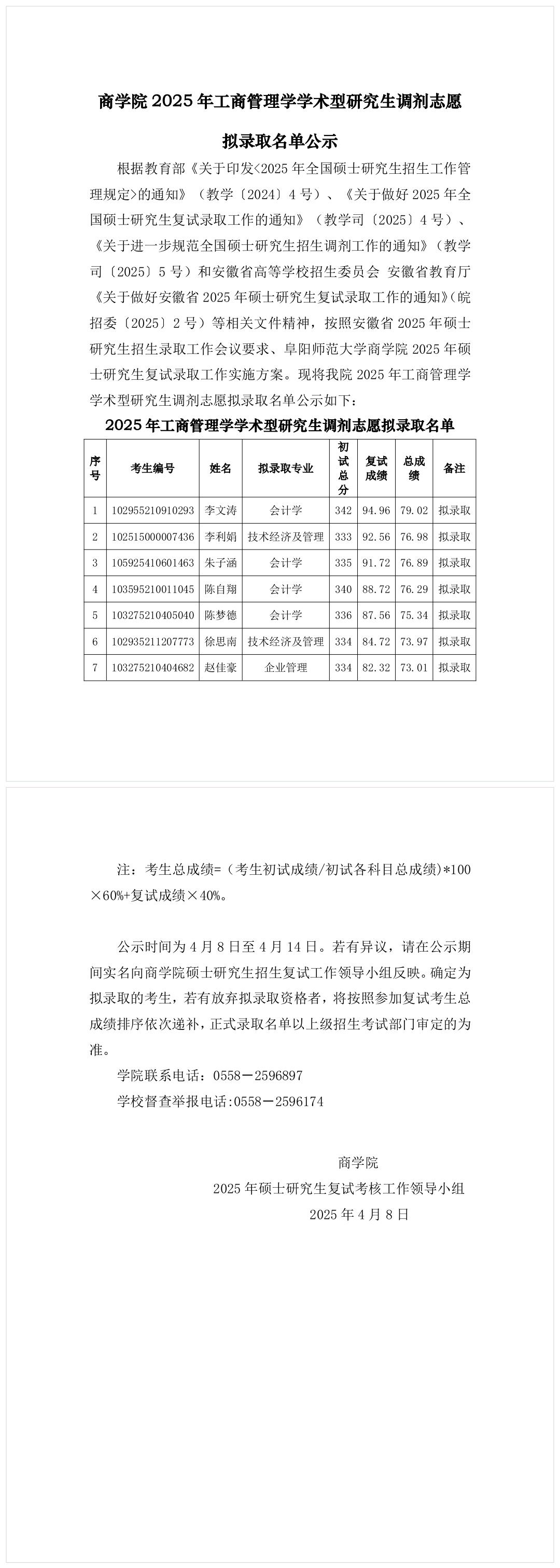 商学院 2025 年工商管理学学术型研究生调剂志愿拟录取名单公示