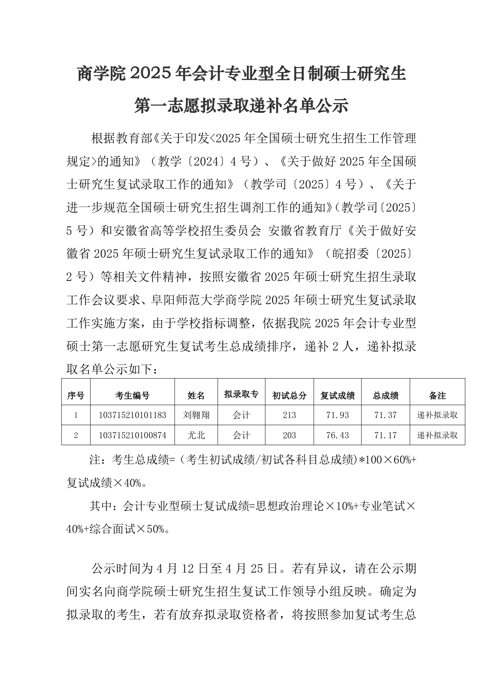 商学院2025年会计专业型全日制硕士研究生第一志愿拟录取递补名单公示
