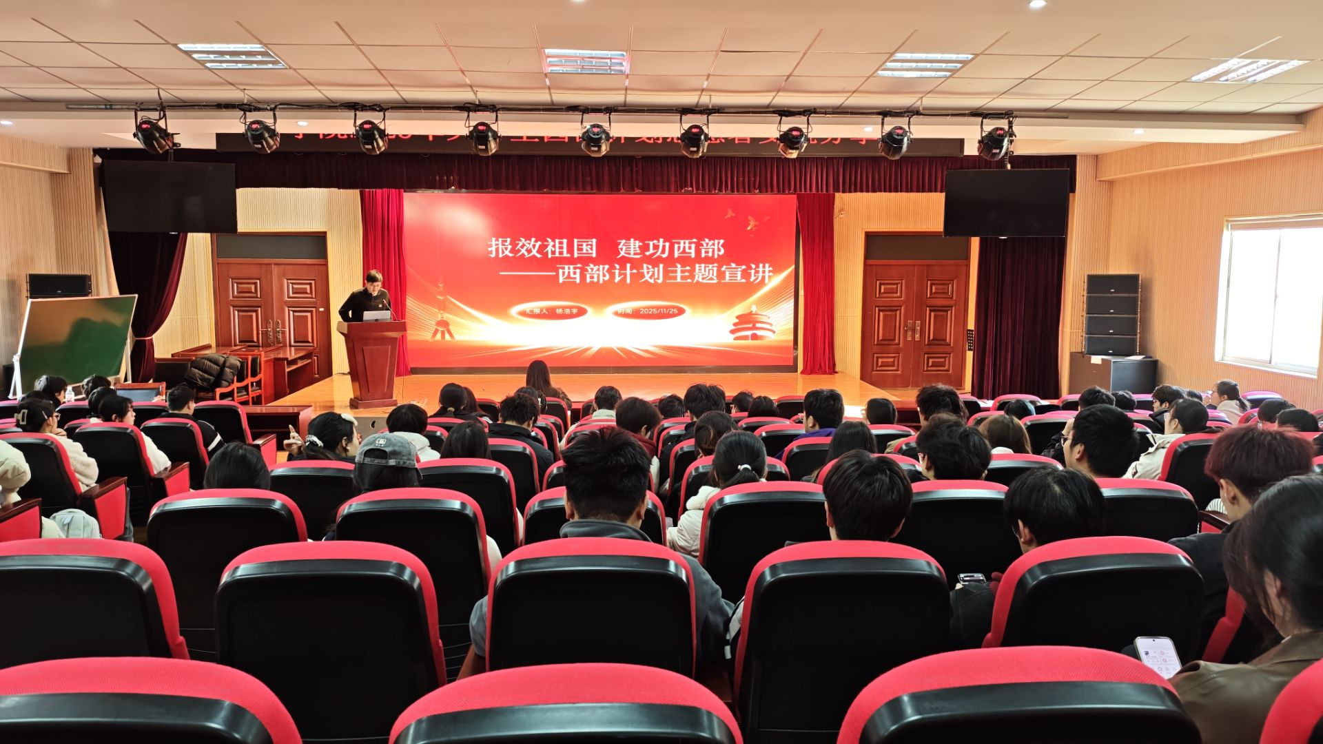 为进一步弘扬“奉献、友爱、互助、进步”的志愿服务精神,引导广大团员青年深入了解西部计划,鼓励学生积极投身西部、服务基层,11月25日下午,我院举办2025年大学生西部计划志愿者交流分享会,邀请2025届财务管理专业校友、现服务于新疆地区的西部计划志愿者杨浩宇主讲,院党委书记宋东锋、团委负责人、就业联络员及120余名团员青年参加分享会。