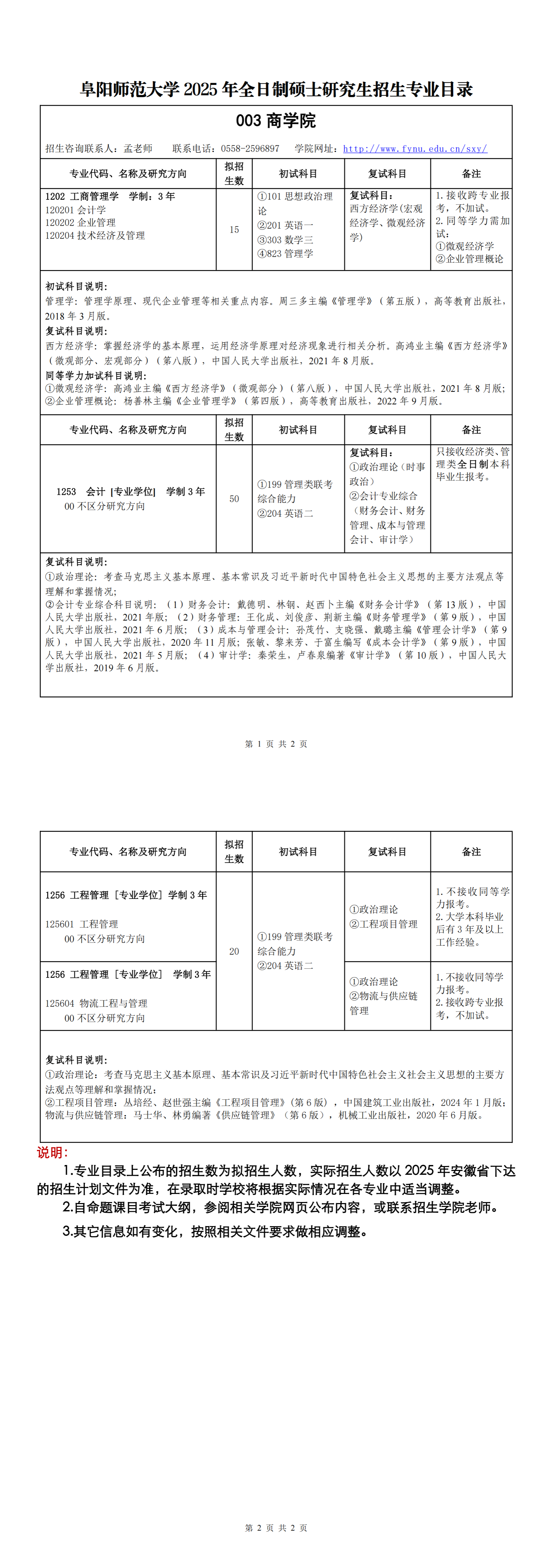 阜阳师范大学2025年全日制硕士研究生招生专业目录
