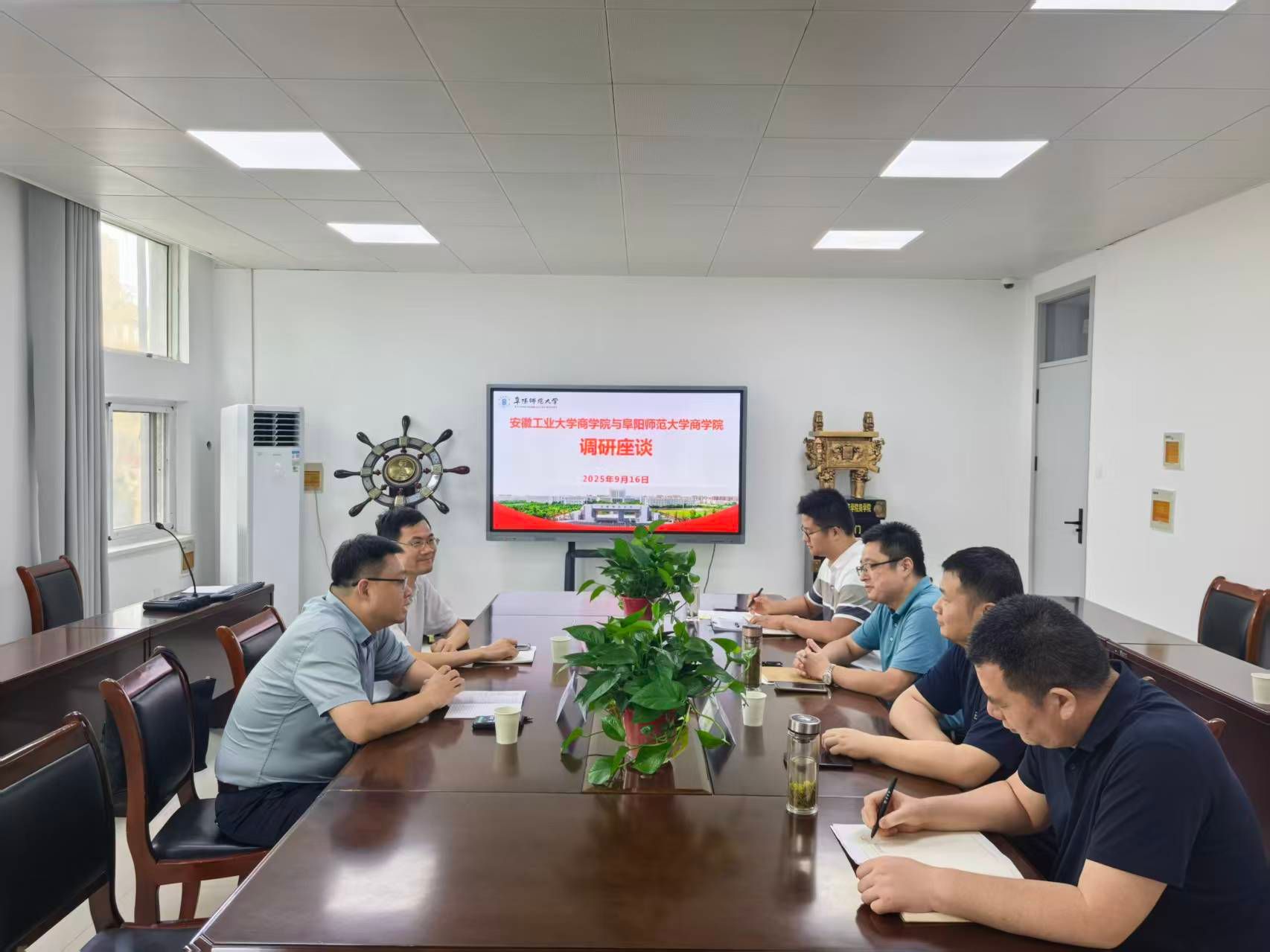 9月16日下午,安徽工业大学商学院党委书记杜飞、院长章铁生率队来我院开展交流。学院党委书记宋东锋、MPAcc中心副主任唐亮以及2026届毕业班辅导员等代表出席座谈会。
