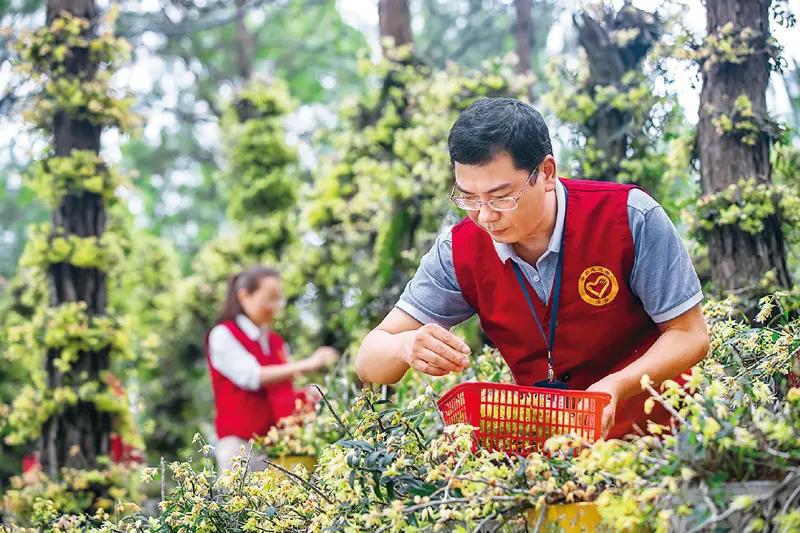 全心全意为人民服务是我们党的根本宗旨。广大党员、干部要向“我将无我,不负人民”的崇高境界看齐,自觉践行人民对美好生活的向往就是我们的奋斗目标的承诺。图为2020年6月23日,浙江省淳安县左口乡党员志愿者在桥西村铁皮石斛种植基地帮助农户采摘铁皮石斛花,服务农民增收致富,助力乡村振兴。人民图片 毛勇锋/摄