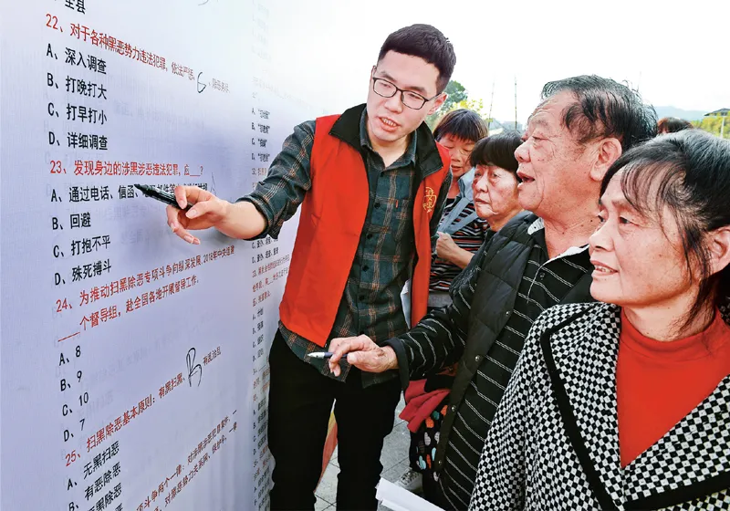 在扫黑除恶专项斗争中,福建省福州市永泰县发挥纪检、政法、公安等职能部门联动作用,建立健全专项斗争长效机制,发动群众检举揭发涉黑涉恶违法犯罪线索,深挖彻查黑恶势力及其背后的“保护伞”,实现社会安定有序、人民安居乐业。图为2020年1月6日,永泰县群众在扫黑除恶专项斗争宣传活动上进行知识竞答。新华社记者 张国俊/摄