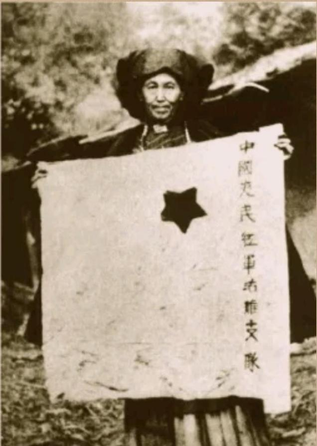 小叶丹的妻子倮伍伍加嫫手持中国夷(彝)民红军沽鸡(果基)支队队旗