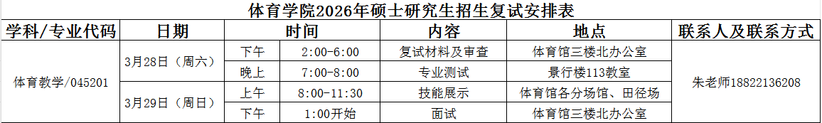 为安全有序做好体育学院2026年硕士研究生复试工作,根据《阜阳师范大学2026年硕士研究生招生复试录取工作方案》,结合体育学院2026年硕士研究生招生工作实际情况,特制定本方案。