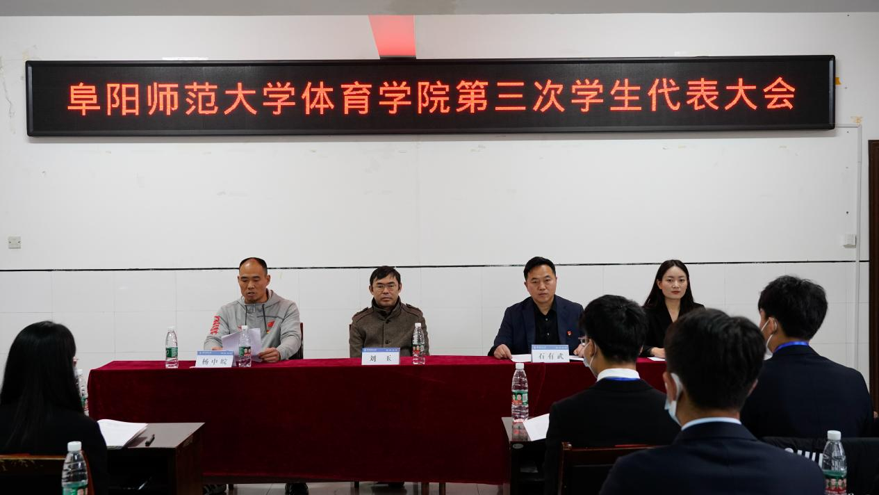 2022年11月19日,阜阳师范大学体育学院第三次学生代表大会在体育馆四楼会议室隆重举行。体育学院党政领导、分团委负责人和43名代表共同出席本次会议,会议由学院副院长杨中皖主持。